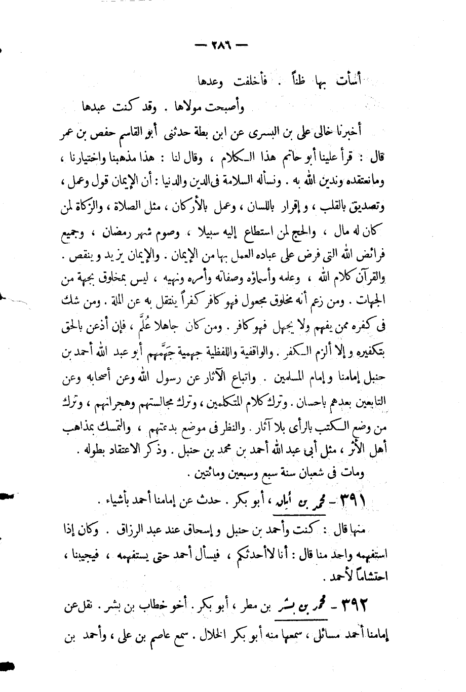 أَخْبَرَنَا خالي عَلِيّ بْن البسري عَنِ ابن بطة حَدَّثَنِي أَبُو الْقَاسِمِ حفص بْن عُمَرَ قَالَ: قرأ علينا أَبُو حاتم هذا الكلام وقال لنا هذا مذهبنا واختيارنا وما نعتقده وندين اللَّه به ونسأله السلامة فِي الدين والدنيا إن الإيمان قول وعمل وتصديق بالقلب وإقرار باللسان وعمل بالأركان مثل الصلاة والزكاة لمن كان له مال والحج لمن استطاع إليه سبيلا وصوم شهر رمضان وجميع فرائض اللَّه التي فرض عَلِيّ عباده العمل بها من الإيمان والإيمان يَزِيد وينقص والقرآن كلام اللَّه وعلمه وأسماؤه وصفاته وأمره ونهيه ليس بمخلوق بجهة من الجهات ومن زعم أنه مخلوق مجعول فهو كافر كفرًا ينتقل به عَنِ الملة ومن شك فِي كفره ممن يفهم ولا يجهل فهو كافر ومن كان جاهلا علم فإن أذعن بالحق بتكفيره وإلا ألزم الكفر والواقفية واللفظية جهمية جهمهم أَبُو عَبْدِ اللَّهِ أَحْمَد بن حنبل إمامنا وإمام المسلمين واتباع الآثار عَنْ رَسُولِ اللَّهِ وعن أصحابه وعَنِ التابعين بعدهم بإحسان وترك كلام المتكلمين وترك مجالستهم وهجرانهم وترك من وضع الكتب بالرأي بلا آثار والنظر فِي موضع بدعتهم والتمسك بمذاهب أهل الأثر مثل أبي عَبْد اللَّه أَحْمَد بن محمد بْنِ حنبل وذكر الاعتقاد بطوله.