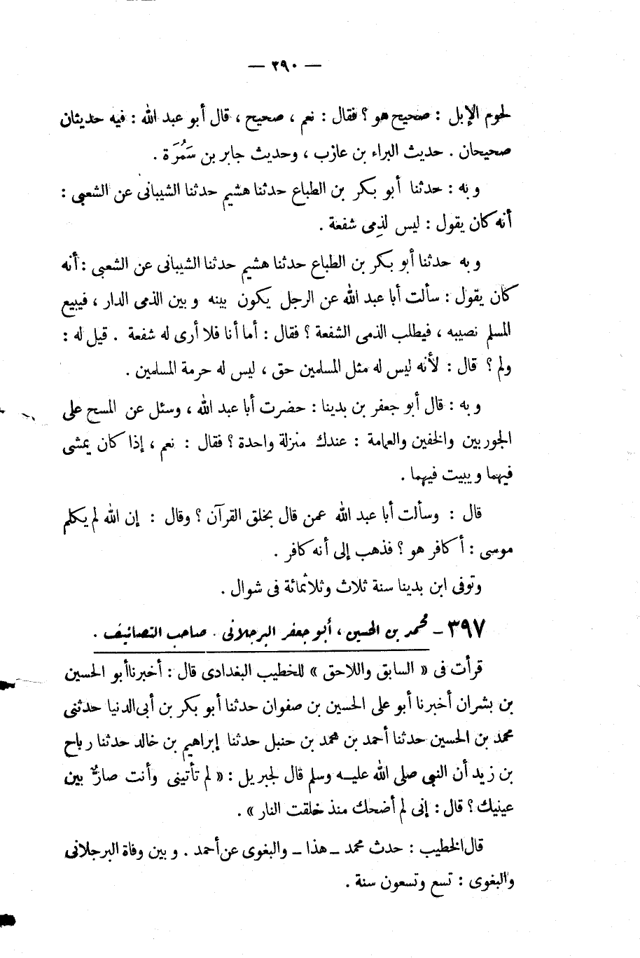 وبه حَدَّثَنَا أَبُو بَكْرِ بْنُ الطباع حَدَّثَنَا هشيم حَدَّثَنَا الشيباني عَنِ الشعبي أنه كان يقول سألت أبا عَبْد اللَّهِ عَنِ الرجل يكون بينه وبين الذمي الدار فيبيع الْمُسْلِم نصيبه فيطلب الذمي الشفعة فقال: أما أنا فلا أرى له شفعة قيل له ولم قَالَ: لأنه ليس له مثل المسلمين حق ليس له حرمة المسلمين.