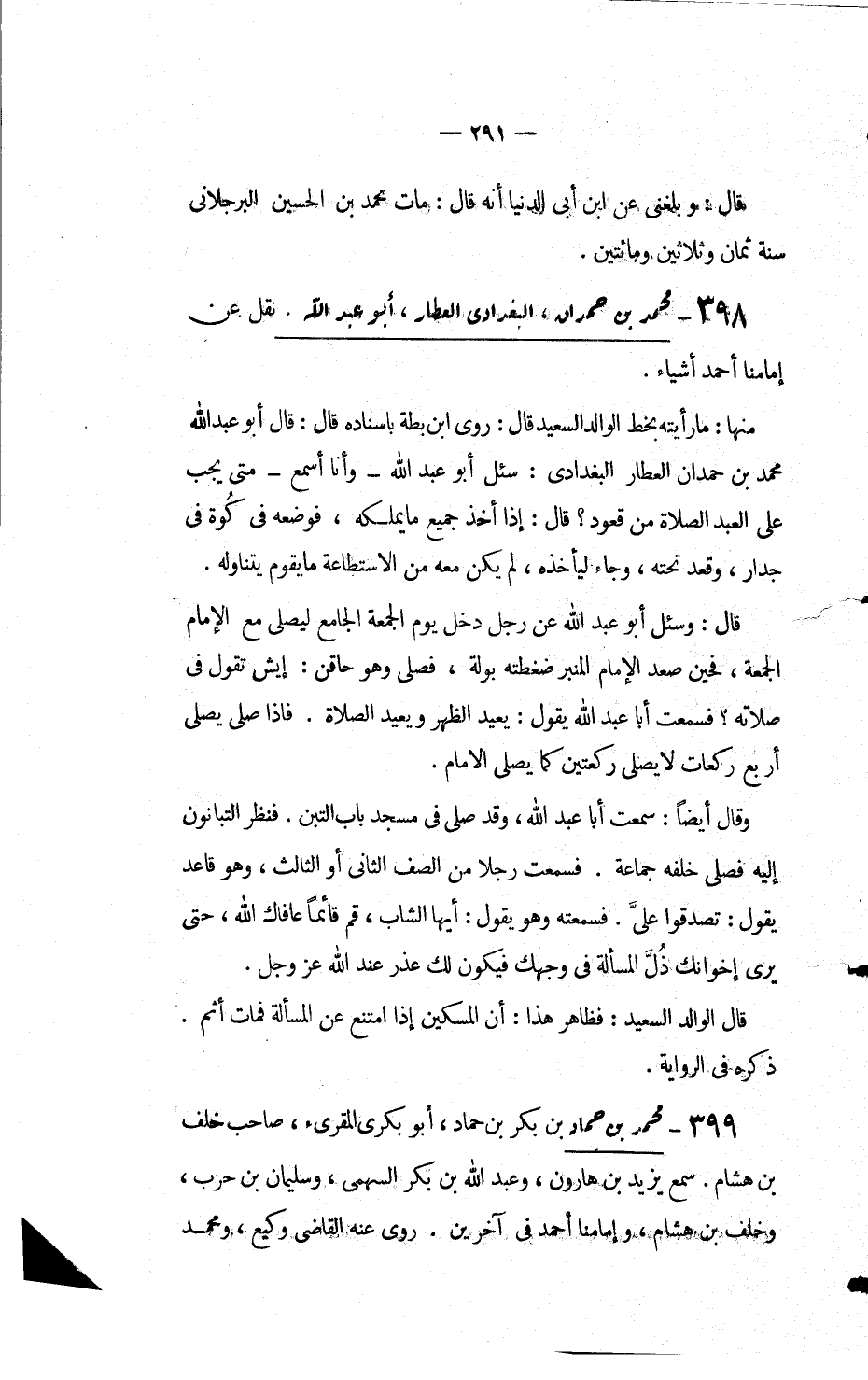 منها ما رأيته بخط الْوَالِدِ السَّعِيدِ قَالَ: روى ابن بطة بإسناده قَالَ: قَالَ أَبُو عَبْدِ اللَّهِ مُحَمَّد بْن حمدان العطار البغدادي سئل أَبُو عَبْدِ اللَّهِ وأنا أسمع متى يجب عَلَى العبد الصلاة من قعود قَالَ: إذا أخذ جميع مايملكه فوضعه فِي كوة فِي جدار وقعد تحته وجاء ليأخذه لم يكن معه من الاستطاعة ما يقوم يتناوله.