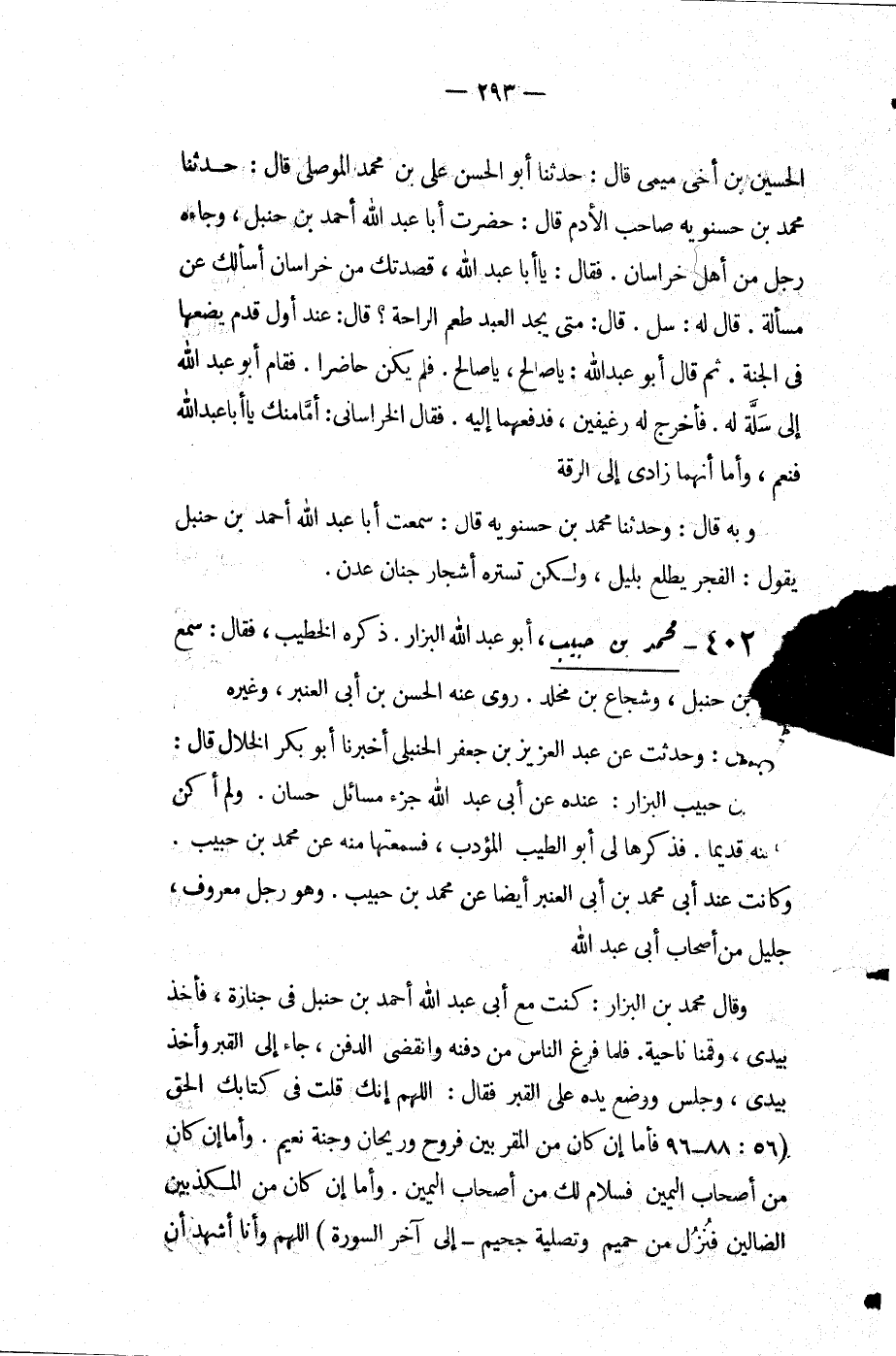 قال وحدثت عَنْ عبد العزيز بْن جَعْفَرٍ الحنبلي أَخْبَرَنَا أَبُو بَكْرٍ الخلال قَالَ: ومحمد بْن حبيب البزار عنده عَنْ أبي عَبْد اللَّهِ جزء مسائل حَسَّان ولم أكن عرفته قديما فذكرها لي أَبُو الطيب المؤدب فسمعتها منه عَنْ مُحَمَّدِ بْنِ حبيب وكانت عند أبي مُحَمَّد بْن أبي العنبر أَيْضًا عَنْ مُحَمَّدِ بْنِ حبيب وهو رجل معروف جليل من أصحاب أبي عَبْد اللَّهِ.
