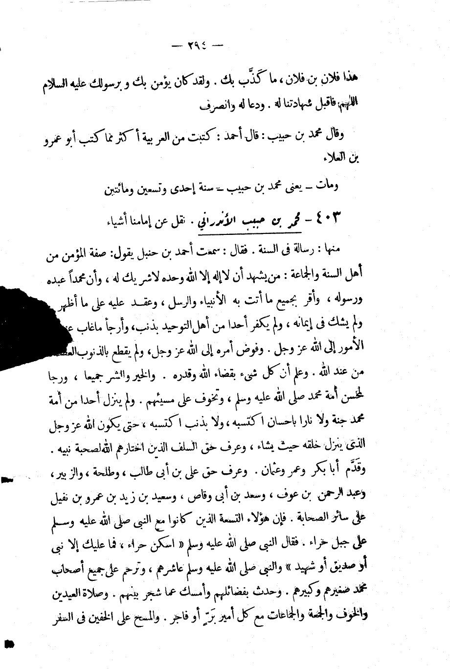 منها رسالة فِي السنة فقال: سمعت أَحْمَد بن حنبل يقول صفة المؤمن من أهل السنة والجماعة من يشهد أن لا إله إلا اللَّه وحده لا شريك له وأن محمدًا عبده ورسوله وأقر بجميع ما أتت به الأنبياء والرسل وعقد عليه عَلَى ما أظهر ولم يشك فِي إيمانه ولم يكفر أحدًا من أهل التوحيد بذنب وأرجأ ما غاب عنه من الأمور إلى اللَّه عَزَّ وَجَلَّ وفوض أمره إلى اللَّه عَزَّ وَجَلَّ ولم يقطع بالذنوب العصمة من عند اللَّه وعلم أن كل شيء بقضاء اللَّه وقدره والخير والشر جميعا ورجا لمحسن أمة محمد - صَلَّى اللَّهُ عَلَيْهِ وَسَلَّمَ - وتخوف عَلَى مسيئهم ولم ينزل أحدًا من أمة مُحَمَّد جنة ولا نارًا بإحسان اكتسبه ولا بذنب اكتسبه حتى يكون الله عز وجل الذي ينزل خلقه حيث يشاء وعرف حق السلف الذين اختارهم اللَّه لصحبة نبيه وقدم أبا بكر وعمر وعثمان وعرف حق عَلِيّ بْن أبي طالب وطلحة والزبير وعَبْد الرَّحْمَنِ بْن عوف وسعد بْن أبي وقاص وسعيد بْن زَيْدِ بْنِ عَمْرِو بْن نفيل عَلَى سائر الصحابة فإن هؤلاء التسعة الذين كانوا مع النَّبِيّ - صَلَّى اللَّهُ عَلَيْهِ وَسَلَّمَ - عَلَى جبل حراء فقَالَ: النَّبِيُّ - صَلَّى اللَّهُ عَلَيْهِ وَسَلَّمَ -: " اسكن حراء فما عليك إلا نَبِيّ أو صديق أو شهيد " والنبي - صَلَّى اللَّهُ عَلَيْهِ وَسَلَّمَ - عاشرهم وترحم عَلَى جميع أصحاب مُحَمَّد صغيرهم وكبيرهم وحدث بفضائلهم وأمسك عما شجر بينهم وصلاة العيدين والخوف والجمعة والجماعات مع كل أمير بر أو فاجر والمسح عَلَى الخفين فِي السفر