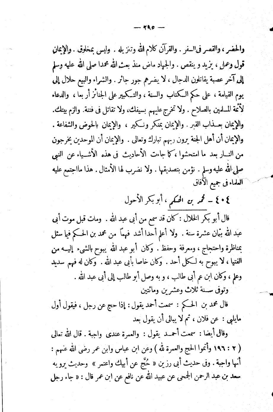 والحضر والقصر فِي السفر والقرآن كلام اللَّه وتنزيله وليس بمخلوق والإيمان قول وعمل يَزِيد وينقص والجهاد ماض منذ بعث اللَّه محمدًا - صَلَّى اللَّهُ عَلَيْهِ وَسَلَّمَ - إلى آخر عصبة يقاتلون الدجال لا يضرهم جور جائر والشراء والبيع حلال إلى يوم القيامة عَلَى حكم الكتاب والسنة والتكبير عَلَى الجنائز أربعا والدعاء لأئمة المسلمين بالصلاح ولا تخرج عليهم بسيفك ولا تقاتل فِي فتنة والزم بيتك والإيمان بعذاب القبر والإيمان بمنكر ونكير والإيمان بالحوض والشفاعة والإيمان أن أهل الجنة يرون ربهم تَبَارَكَ وَتَعَالَى والإيمان أن الموحدين يخرجون من النار بعد ما امتحشوا كما جاءت الأحاديث فِي هذه الأشياء عَنِ النَّبِيّ - صَلَّى اللَّهُ عَلَيْهِ وَسَلَّمَ - نؤمن بتصديقها ولا نضرب لها الأمثال هذا ما اجتمع عليه العلماء فِي جميع الآفاق.
