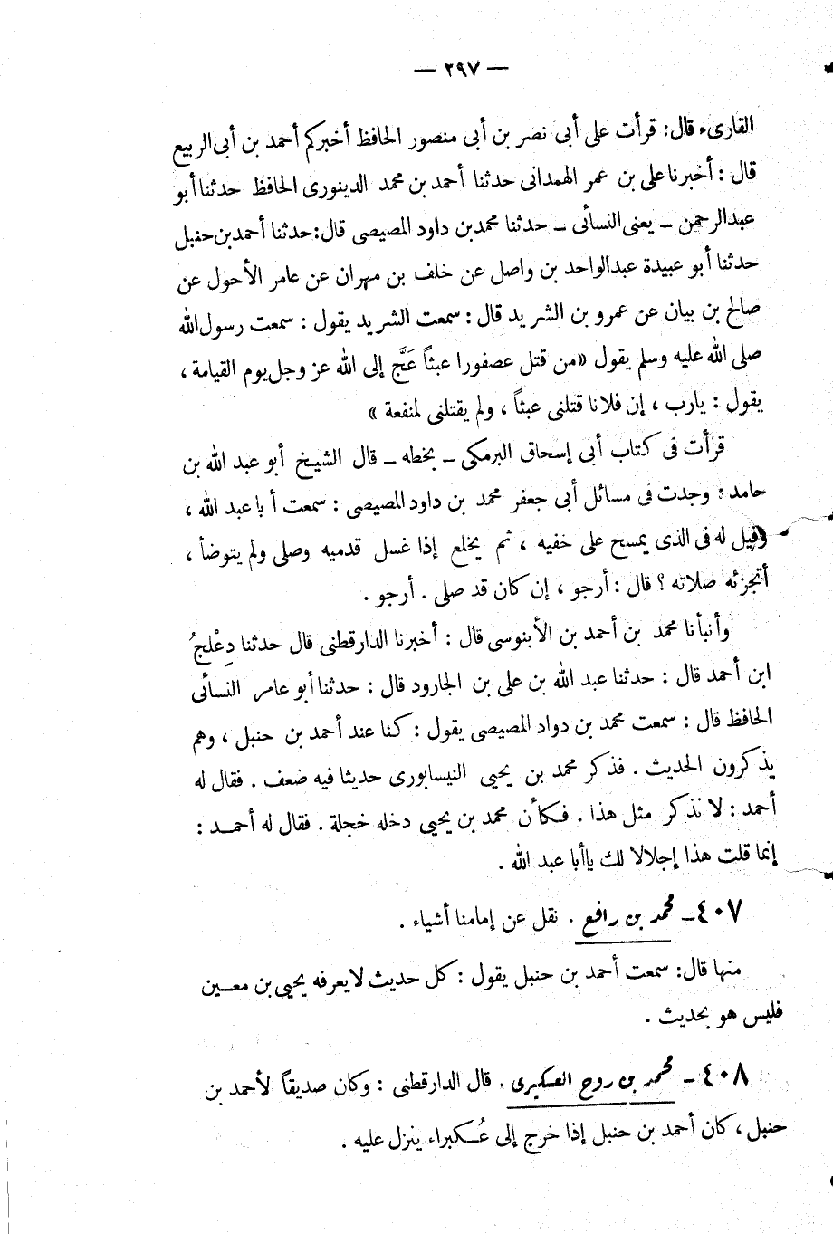 القارئ قال: قرأت عَلَى أَبِي نَصْرِ بْنِ أَبِي مَنْصُورٍ الْحَافِظُ أَخْبَرَكُمُ أَحْمَدُ بْنُ أَبِي الرَّبِيعِ قَالَ: أَخْبَرَنَا عَلِيُّ بْنُ عُمَرَ الْهَمْدَانِيُّ حَدَّثَنَا أَحْمَدُ بْنُ مُحَمَّدٍ الدَّيْنَوَرِيُّ الْحَافِظُ حَدَّثَنَا أَبُو عَبْدِ الرَّحْمَنِ يَعْنِي النَّسَائِيَّ حَدَّثَنَا مُحَمَّدُ بْنُ دَاوُدَ الْمِصِّيصِيُّ قَالَ: حَدَّثَنَا أَحْمَد بْن حنبل حَدَّثَنَا أَبُو عُبَيْدَةَ عَبْدُ الْوَاحِدِ بْنُ وَاصِلٍ عَنْ خَلَفِ بْنِ مِهْرَانَ عَنْ عَامِرٍ الأَحْوَلِ عَنْ صَالِحِ بْنِ بَيَانٍ عَنْ عَمْرِو بْنِ الشَّرِيدِ قَالَ: سَمِعْتُ الشَّرِيدَ يَقُولُ سَمِعْتُ رَسُولَ اللَّهِ - صَلَّى اللَّهُ عَلَيْهِ وَسَلَّمَ - يَقُولُ: " مَنْ قَتَلَ عُصْفُورًا عَبَثًا عَجَّ إِلَى اللَّهِ عَزَّ وَجَلَّ يَوْمَ الْقِيَامَةِ يَقُولُ: يَا رَبُّ إِنَّ فُلانًا قَتَلَنِي عَبَثًا وَلَمْ يَقْتُلْنِي لِمَنْفَعَةٍ ".