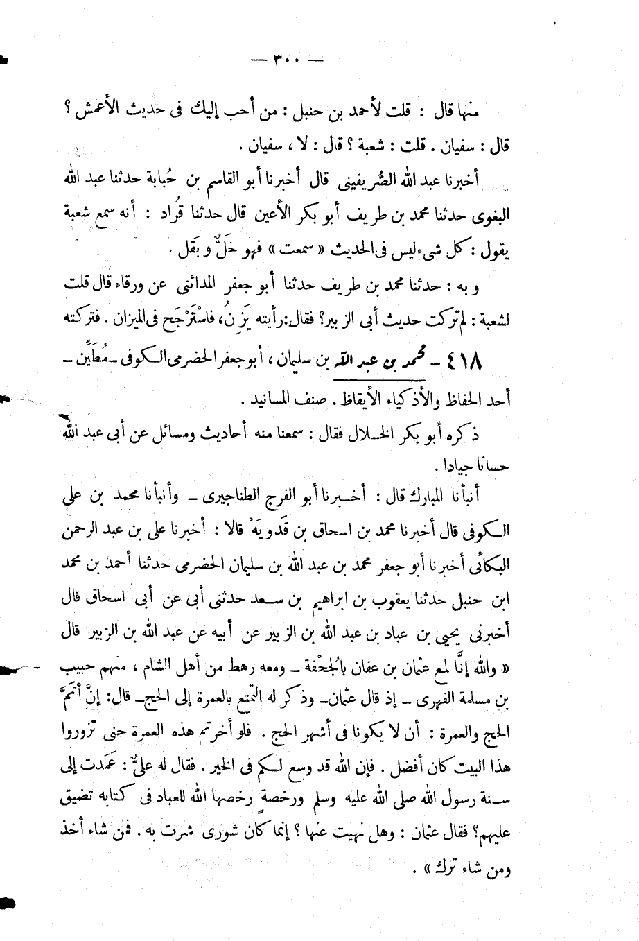 منها قَالَ: قلت: لأحمد بْن حنبل من أحب إليك فِي حديث الأعمش قَالَ: سفيان قلت: شُعْبَة قَالَ: لا سفيان.