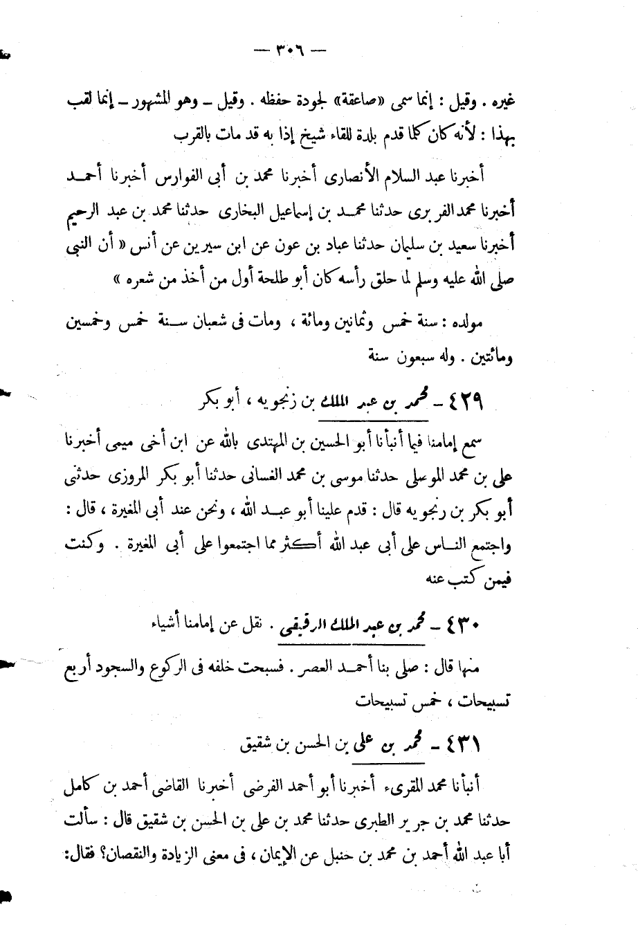 أنبأنا محمد المقرىء أَخْبَرَنَا أَبُو أَحْمَد الفرضي أَخْبَرَنَا القاضي أَحْمَد بْن كامل حَدَّثَنَا مُحَمَّد بْن جرير الطبري حَدَّثَنَا مُحَمَّد بْن عَلِيِّ بْنِ الحسن بْن شقيق قَالَ: سألت أبا عبد اللَّه أحمد بن محمد بْنِ حنبل عَنِ الإيمان فِي معنى الزيادة والنقصان فقال: