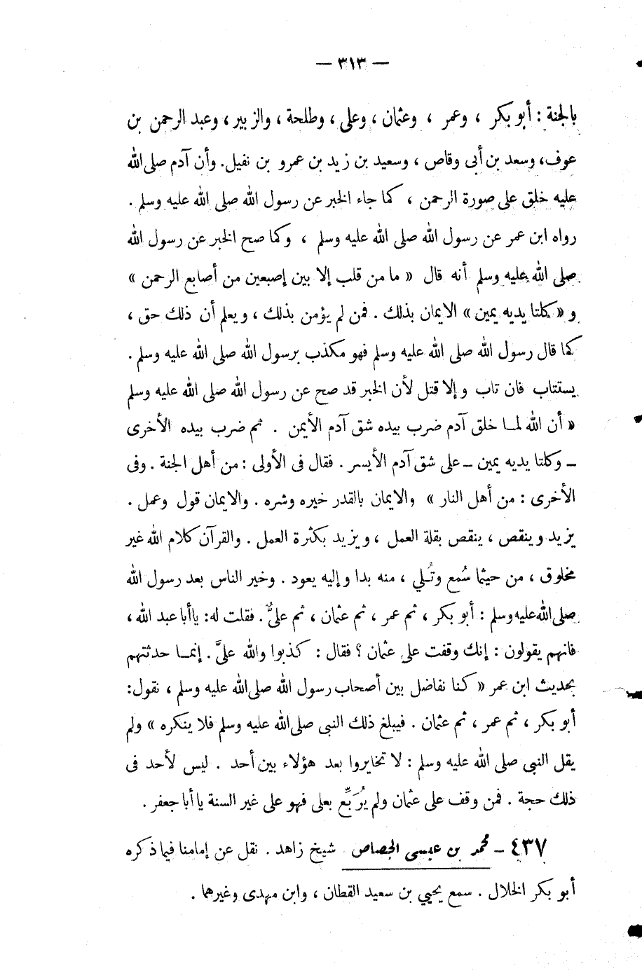 بالجنة أبو بكر وعمر وعثمان وعلي وطلحة والزبير وعَبْد الرَّحْمَنِ بْن عوف وسعد بْن أبي وقاص وسعيد بْن زَيْدِ بْنِ عَمْرِو بْن نفيل وأن آدم - صَلَّى اللَّهُ عَلَيْهِ وَسَلَّمَ - خلق عَلَى صورة الرحمن كما جاء الخبر عَنْ رَسُولِ اللَّهِ - صَلَّى اللَّهُ عليه وسلم - رواه ابن عُمَر عَنْ رَسُولِ اللَّهِ - صَلَّى اللَّهُ عَلَيْهِ وَسَلَّمَ - وكما صح الخبر عَنْ رَسُولِ اللَّهِ - صَلَّى اللَّهُ عَلَيْهِ وَسَلَّمَ - أنه قَالَ: " ما من قلب إلا بين إصبعين من أصابع الرحمن " و " كلتا يديه يمين الإيمان " بذلك فمن لم يؤمن بذلك ويعلم أن ذلك حق كما قَالَ: رَسُول اللَّهِ - صَلَّى اللَّهُ عَلَيْهِ وَسَلَّمَ - فهو مكذب برَسُول اللَّهِ - صَلَّى اللَّهُ عَلَيْهِ وَسَلَّمَ - يستتاب فإن تاب