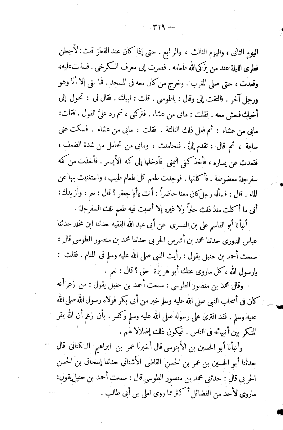 وقال مُحَمَّد بْن منصور الطوسي سمعت أحمد بن حنبل يقول من زعم أنه كان فِي أصحاب النَّبِيّ - صَلَّى اللَّهُ عَلَيْهِ وَسَلَّمَ - خير من أبي بكر فولاه رَسُول اللَّهِ - صَلَّى اللَّهُ عَلَيْهِ وَسَلَّمَ - فقد افترى عَلَى رسوله - صَلَّى اللَّهُ عَلَيْهِ وَسَلَّمَ - وكفر بأن زعم أن اللَّه يقر المنكر بين أنبيائه فِي الناس فيكون ذلك إضلالا لهم وأَنْبَأَنَا أبو الحسين بْن الأبنوسي قَالَ: أَخْبَرَنَا عُمَر بْن إِبْرَاهِيمَ الكتاني قَالَ: حَدَّثَنَا أَبُو الحسين بْن عُمَرَ بْنِ الحسن القاضي الأشناني حَدَّثَنَا إِسْحَاق بْن الحسن الحربي قَالَ: حَدَّثَنِي مُحَمَّد بْن منصور الطوسي قَالَ: سمعت أَحْمَد بن حنبل يقول ما روي لأحد من الفضائل أكثر مما روى لعلي بن أبي طالب.