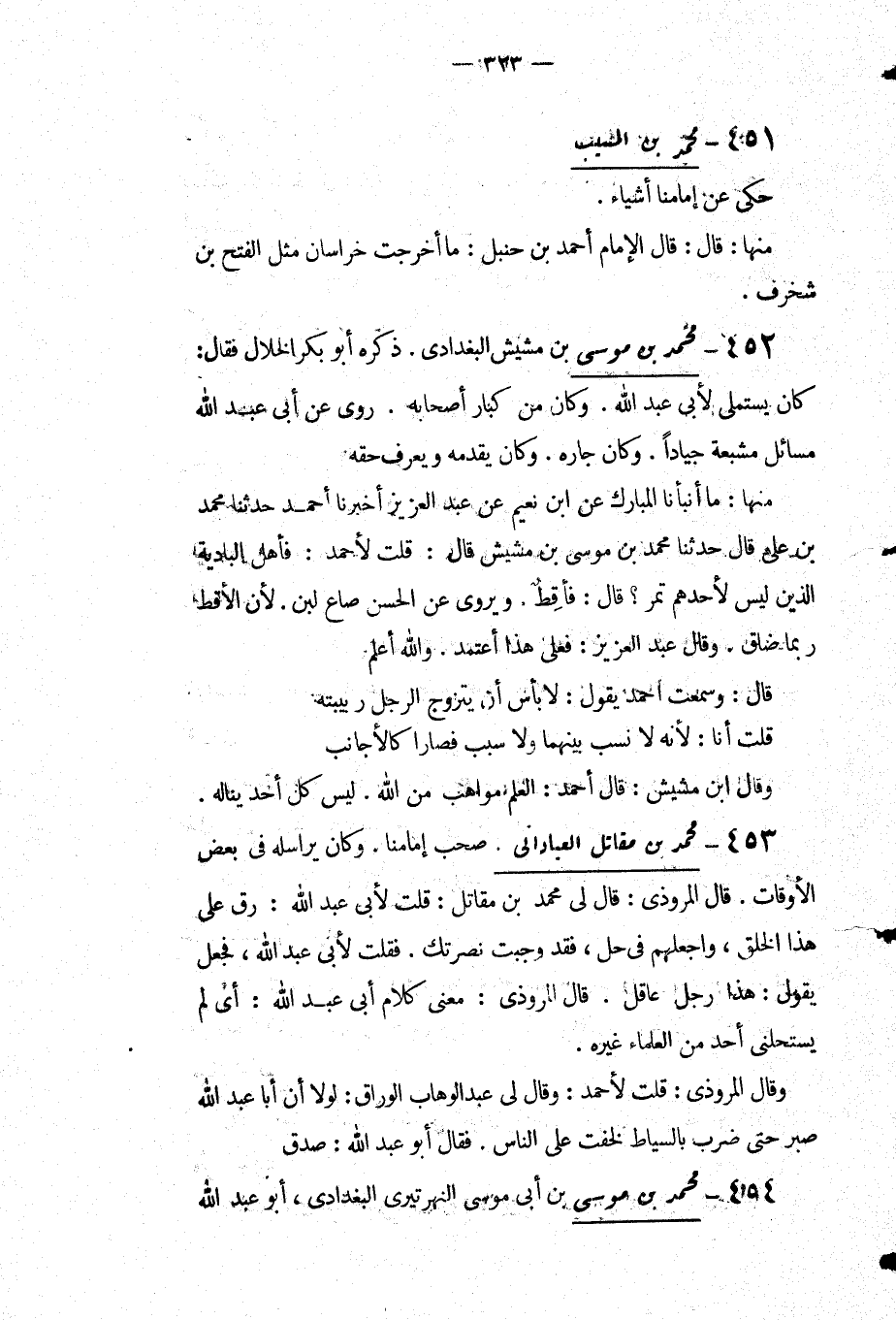 مُحَمَّد بْن مُوسَى بْن مشيش البغدادي ذكره أَبُو بَكْرٍ الخلال فقال: كان يستملي لأبي عبد الله كان من كبار أصحابه روى عَنْ أبي عَبْد اللَّهِ مسائل مشبعة جيادا وكان جازه وكان يقدمه ويعرف حقه.