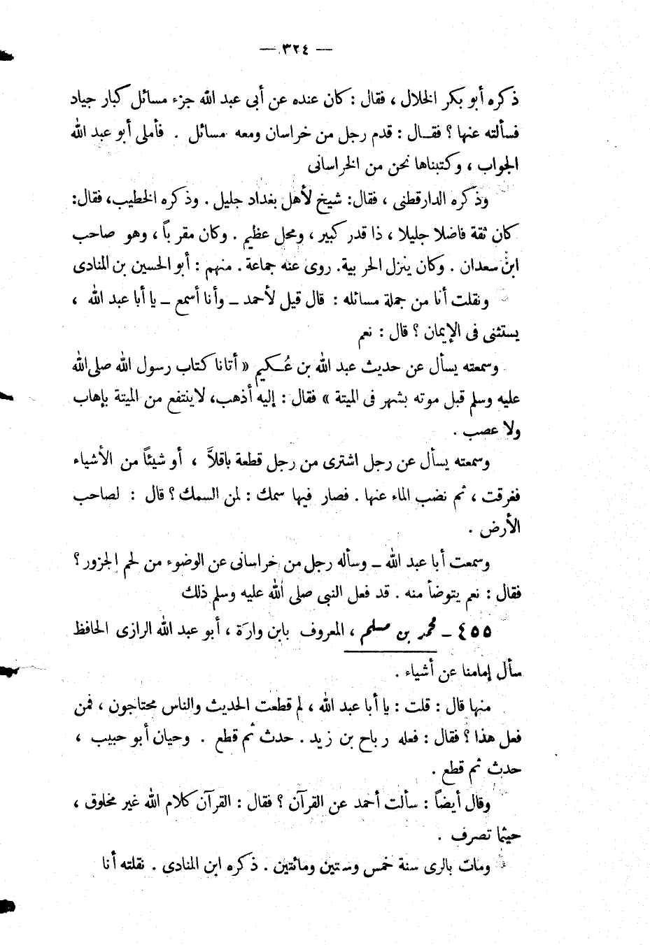 مُحَمَّد بْن مُسْلِمٍ المعروف بابن وارة أبو عَبْد اللَّهِ الرازي الحافظ سأل إمامنا عَنْ أشياء