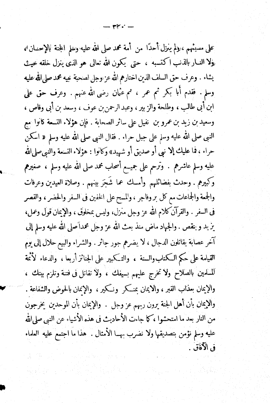 عَلَى مسيئهم ولم ينزل أحدًا من أمة محمد - صَلَّى اللَّهُ عَلَيْهِ وَسَلَّمَ - الجنة بالإحسان ولا النار بالذنب اكتسبه حتى يكون اللَّه تعالى هو الذي ينزل خلقه حيث يشاء وعرف حق السلف الذين اختارهم اللَّه عَزَّ وَجَلَّ لصحبة نبيه مُحَمَّد - صَلَّى اللَّهُ عَلَيْهِ وَسَلَّمَ - فقدم أبا بَكْرٍ ثم عُمَر ثم عُثْمَان رَضِيَ اللَّهُ عنهم وعرف حق عَلِيّ بْن أبي طالب وطلحة والزبير وعَبْد الرَّحْمَنِ بْن عوف وسعد بْن أبي وقاص وسعيد بْن زَيْدِ بْنِ عَمْرِو بْن نفيل عَلَى سائر الصحابة فإن هؤلاء التسعة كانوا مع النَّبِيّ - صَلَّى اللَّهُ عَلَيْهِ وَسَلَّمَ - عَلَى جبل حراء فقَالَ: النَّبِيُّ - صَلَّى اللَّهُ عَلَيْهِ وَسَلَّمَ -: " اسكن حراء فما عليك إلا نَبِيّ أو صديق أو شهيد " وكانوا هؤلاء التسعة والنبي - صَلَّى اللَّهُ عَلَيْهِ وَسَلَّمَ - عاشرهم وترحم عَلَى جميع أصحاب محمد - صَلَّى اللَّهُ عَلَيْهِ وَسَلَّمَ - صغيرهم وكبيرهم وحدث بفضائلهم وأمسك عما شجر بينهم وصلاة العيدين وعرفات والجمعة والجماعات مع كل بر وفاجر والمسح عَلَى الخفين فِي السفر والحضر والقصر فِي السفر والقرآن كلام اللَّه عَزَّ وَجَلَّ منزل وليس بمخلوق والإيمان قول وعمل يَزِيد وينقص والجهاد ماض منذ بعث اللَّه عَزَّ وَجَلَّ محمدًا - صَلَّى اللَّهُ عَلَيْهِ وَسَلَّمَ - إلى آخر عصابة يقاتلون الدجال لا يضرهم جور جائر والشراء والبيع حلال إلى يوم القيامة عَلَى حكم الكتاب والسنة والتكبير عَلَى الجنائز أربعا والدعاء لأئمة المسلمين بالصلاح ولا تخرج عليهم بسيفك ولا تقاتل فِي فتنة وتلزم بيتك والإيمان بعذاب القبر والإيمان بمنكر ونكير والإيمان بالحوض والشفاعة والإيمان بأن أهل الجنة يرون ربهم عَزَّ وَجَلَّ والإيمان بأن الموحدين يخرجون من النار بعد ما امتحشوا كما جاءت الأحاديث فِي هذه الأشياء عَنِ النَّبِيِّ - صَلَّى اللَّهُ عَلَيْهِ وَسَلَّمَ - نؤمن بتصديقها ولا نضرب بها الأمثال هذا ما اجتمع عليه العلماء فِي الآفاق.