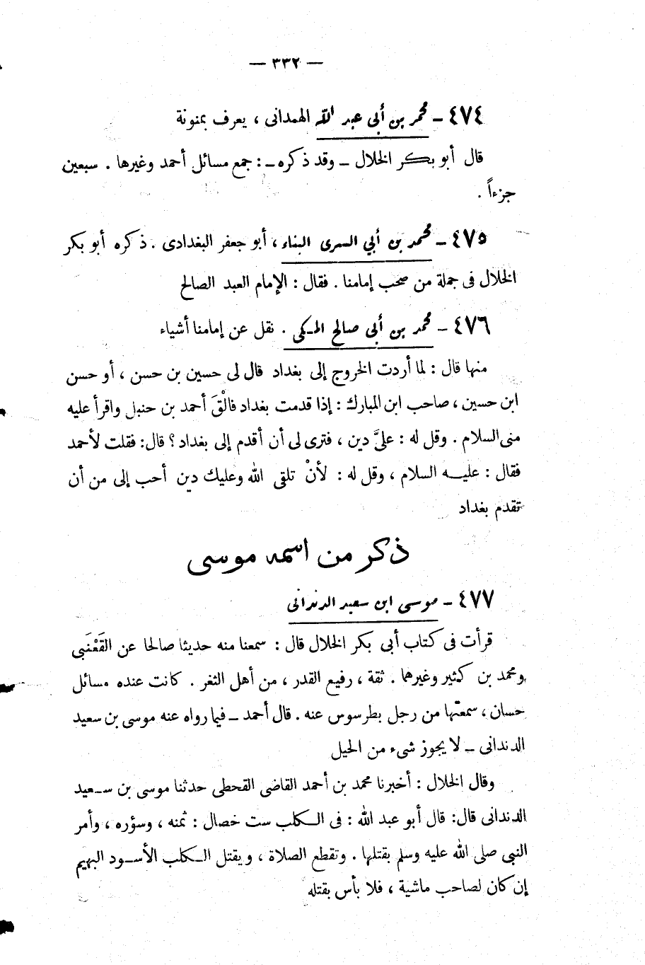 قرأت فِي كتاب أبي بكر الخلال قَالَ: سمعنا منه حديثا صالحا عَنِ القعنبي ومحمد بْن كثير وغيرهما ثقة رفيع القدر من أهل الثغر، كانت عنده مسائل حسان سمعتها من رجل بطرسوس عنه قَالَ: أَحْمَد فيما رواه عنه مُوسَى بْن سعيد الدنداني لا يجوز شيء من الحيل.