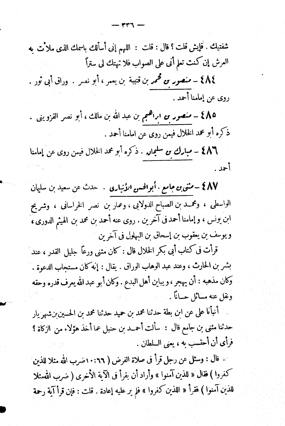 قرأت كتاب أبي بكر الخلال قَالَ: كان مثنى ورعا جليل القدر عند بشر بن الحارث وعند عبد الوهاب الوراق يقال إنه كان مستجاب الدعوة وكان مذهبه أن يهجر ويباين أهل البدع وكان أَبُو عَبْدِ اللَّهِ يعرف قدره وحقه ونقل عنه مسائل حسانا.
