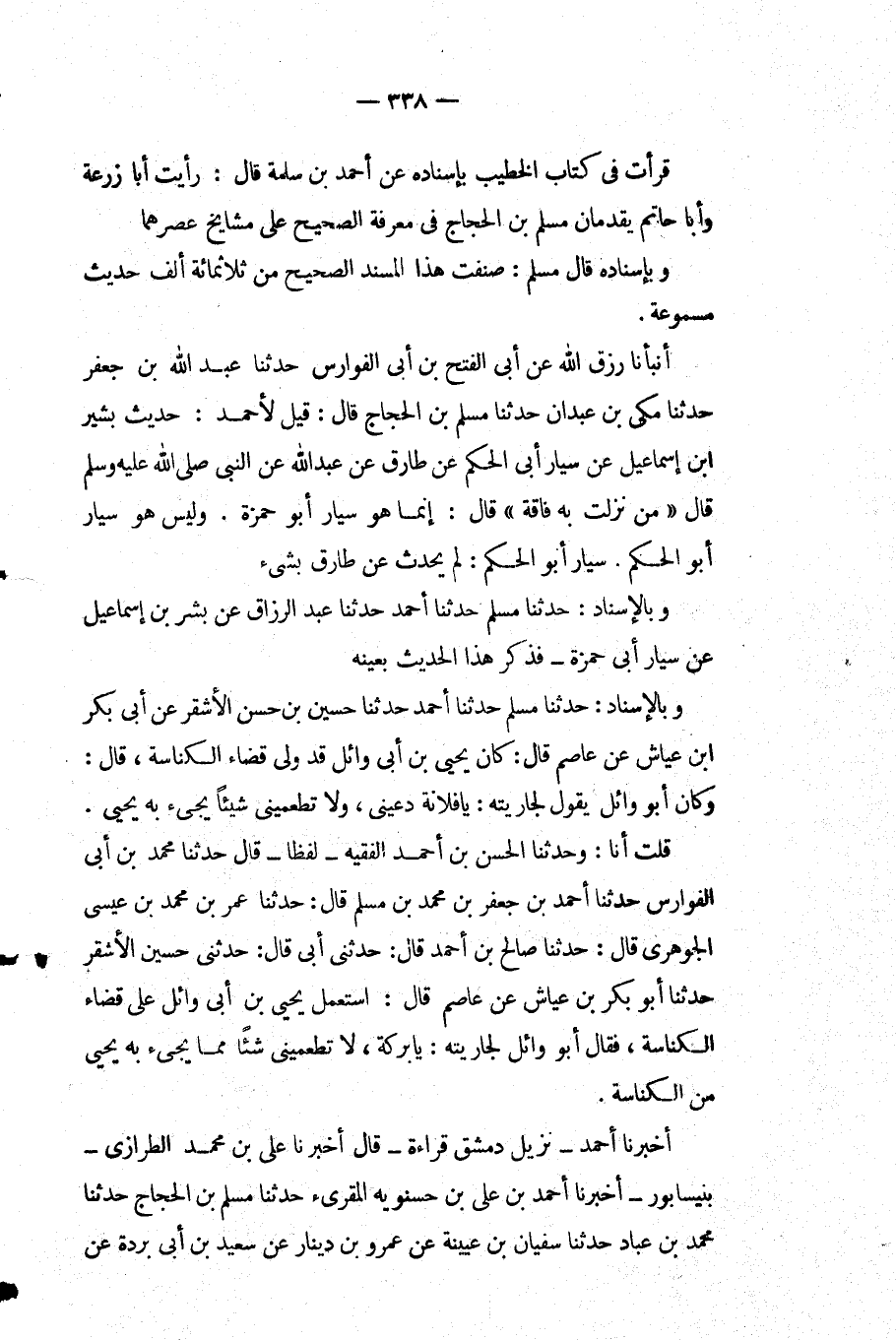 أَنْبَأَنَا رِزْقٌ اللَّه عَنْ أبي الفتح بْن أَبِي الْفَوَارِسِ حَدَّثَنَا عَبْدُ اللَّهِ بْنُ جَعْفَرٍ حَدَّثَنَا مَكِيُّ بْنُ عَبْدَانَ حَدَّثَنَا مُسْلِمُ بْنُ الْحَجَّاجِ قَالَ: قِيلَ لأَحْمَدَ حَدِيثُ بَشِيرِ بْنِ إِسْمَاعِيلَ عَنْ سَيَّارٍ أَبِي الْحَكَمِ عَنْ طَارِقٍ عَنْ عَبْدِ اللَّهِ عَنِ النَّبِيِّ - صَلَّى اللَّهُ عَلَيْهِ وَسَلَّمَ - قَالَ: " مَنْ نَزَلَتْ بِهِ فَاقَةٌ " قَالَ: إِنَّمَا هُوَ سيار أبو حمزة وليس هُوَ سَيَّارٌ أَبُو الْحَكَمِ سَيَّارٌ أَبُو الْحَكَمِ لَمْ يُحَدِّثْ عَنْ طَارِقٍ بِشَيْءٍ وبالإسناد حَدَّثَنَا مُسْلِم حَدَّثَنَا أَحْمَدُ حَدَّثَنَا عَبْدُ الرَّزَّاقِ عَنْ بشر بْن إِسْمَاعِيلَ عَنْ سيار أبي حمزة فذكر هذا الحديث بعينه.