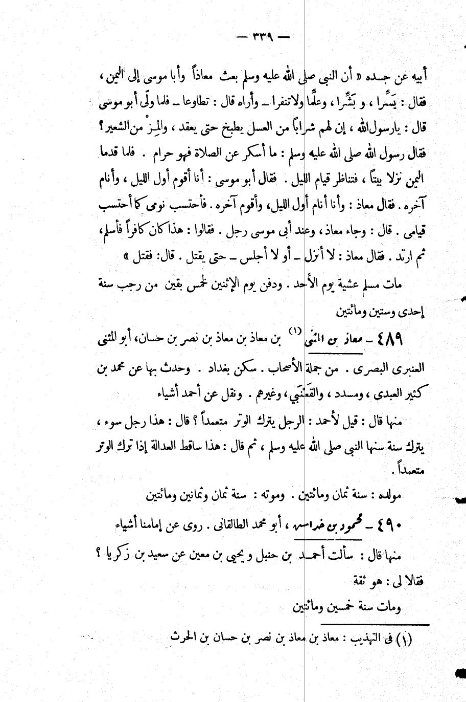 معاذ بْن المثنى بن معاذ بْن معاذ بْن نَصْرِ بن حَسَّان أَبُو المثنى العنبري البصري من جملة الأصحاب سكن بغداد وحدث بها عَنْ مُحَمَّد بْن كثير العبدي ومسدد والقعنبي وغيرهم ونقل عَنْ أَحْمَد أشياء: