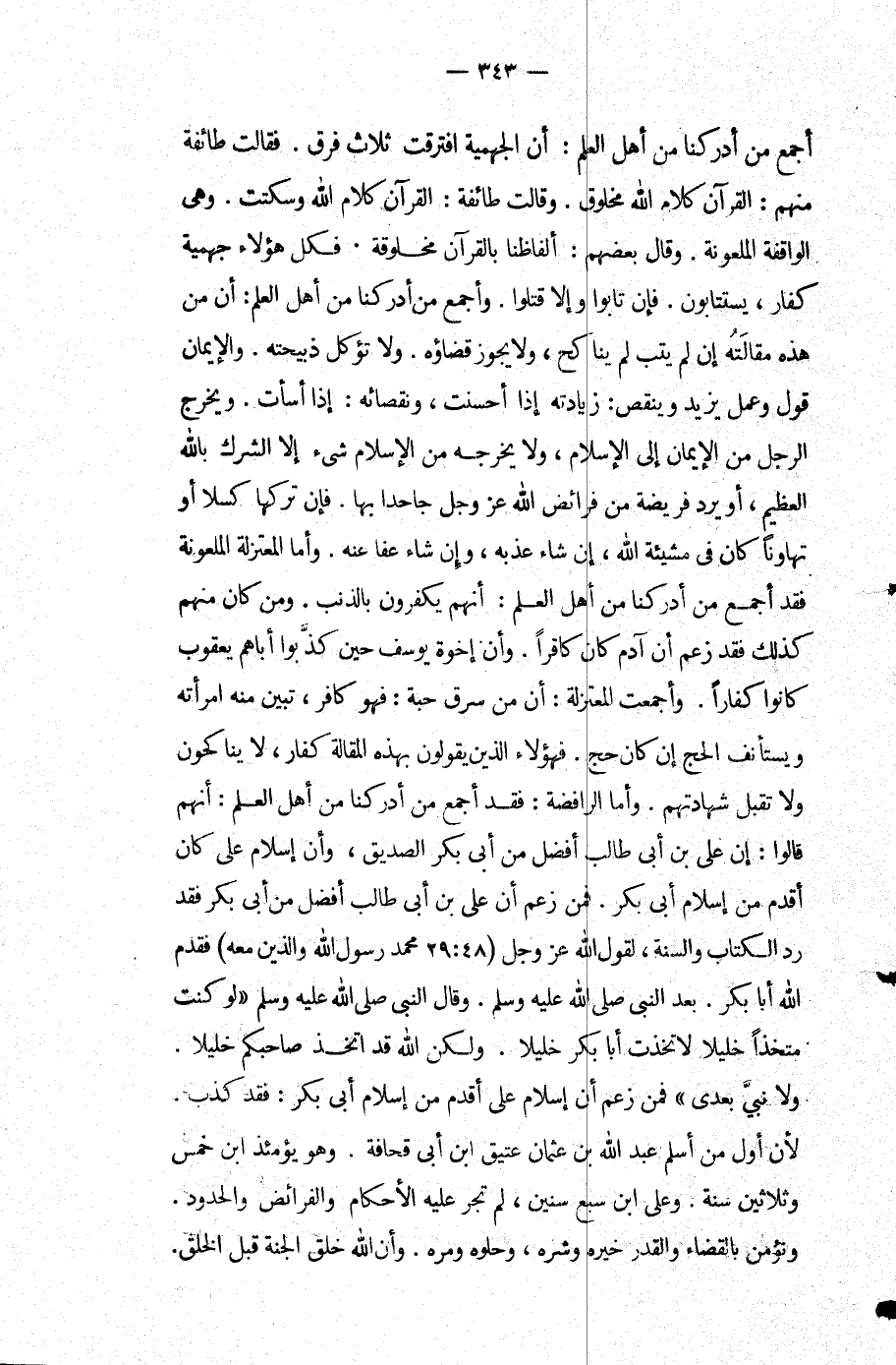 والإيمان قول وعمل يَزِيد وينقص زيادته إذا أحسنت ونقصانه إذا أسأت ويخرج الرجل من الإيمان إلى الإسلام ولا يخرجه من الإسلام شيء إلا الشرك بالله العظيم أو يرد فريضة من فرائض اللَّه عَزَّ وَجَلَّ جاحدًا بها فإن تركها كسلا أو تهاونا كان فِي مشيئة اللَّه إن شاء عذبه وإن شاء عفا عنه وأما المعتزلة الملعونة فقد أجمع من أدركنا من أهل العلم أنهم يكفرون بالذنب ومن كان منهم كذلك فقد زعم أن آدم كان كافرًا وأن إخوة يوسف حين كذبوا أباهم يَعْقُوب كانوا كفارًا وأجمعت المعتزلة أن من سرق حبة فهو كافر تبين منه امرأته ويستأنف الحج إن كان يحج فهؤلاء الذين يقولون بهذه المقالة كفار لا يناكحون ولا تقبل شهادتهم وأما الرافضة فقد أجمع من أدركنا من أهل العلم أنهم قالوا أن عَلِيّ بْن أبي طالب أفضل من أبي بكر الصديق وأن إسلام عَلِيّ كان أقدم من إسلام أبي بكر فمن زعم أن عَلِيّ بْن أبي طالب أفضل من أبي بكر فقد رد الكتاب والسنة لقول اللَّه عَزَّ وَجَلَّ " مُحَمَّدٌ رَسُولُ اللَّهِ وَالَّذِينَ مَعَهُ " فقدم اللَّه أبا بكر بعد النَّبِيّ - صَلَّى اللَّهُ عَلَيْهِ وَسَلَّمَ - وقَالَ النَّبِيُّ - صَلَّى اللَّهُ عَلَيْهِ وَسَلَّمَ -: " لو كنت متخذًا خليلا لاتخذت أبا بكر خليلا ولكن اللَّه قد اتخذ صاحبكم خليلا ولا نَبِيّ بعدي " فمن زعم أن إسلام عَلِيّ أقدم من إسلام أبي بكر فقد كذب لأن أول من أسلم عَبْد الله بن عثمان عتيق ابن أبي قحافة وهو يومئذ ابن خمس وثلاثين سنة وعلي ابن سبع سنين لم تجر عليه الأحكام والفرائض والحدود ونؤمن بالقضاء والقدر خيره وشره وحلوه ومره وأن اللَّه خلق الجنة قبل الخلق