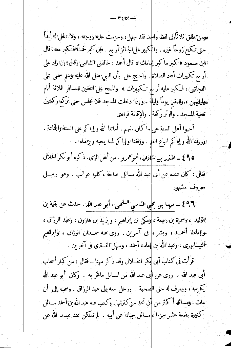 ومن طلق ثلاثا فِي لفظ واحد فقد جهل وحرمت عليه زوجته ولا تحل له أبدًا حتى تنكح زوجا غيره والتكبير عَلَى الجنائز أربع فإن كبر خمسا فكبر معه قَالَ: ابْن مَسْعُودٍ كبر ما كبر إمامك قَالَ: أَحْمَد خالفني الشافعي وقال إن زاد عَلَى أربع تكبيرات أعاد الصلاة وأحتج عَلِيّ بأَنَّ النَّبِيّ - صَلَّى اللَّهُ عَلَيْهِ وَسَلَّمَ - صلّى عَلَى النجاشي فكبر عليه أربع تكبيرات والمسح عَلَى الخفين للمسافر ثلاثة أيام ولياليهن وللمقيم يوما وليلة وإذا دخلت المسجد فلا تجلس حتى تركع ركعتين تحية المسجد والوتر ركعة والإقامة فرادى.