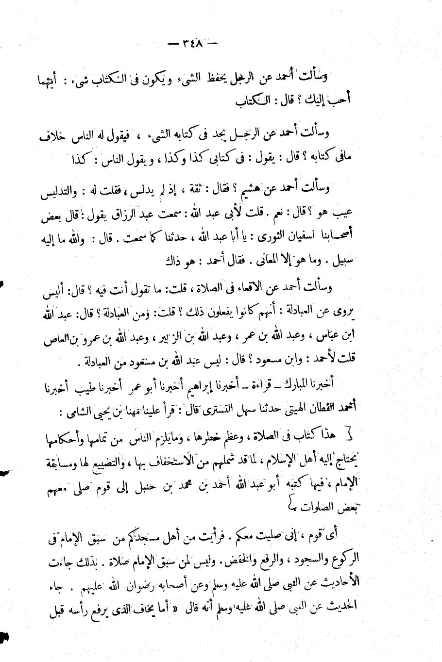 هذا كتاب فِي الصلاة وعظم خطرها وما يلزم الناس من تمامها وأحكامها يحتاج إليه أهل الإسلام لما قد شملهم من الاستخفاف بها والتضييع لها ومسابقة الإمام فيها كتبه أَبُو عَبْدِ اللَّهِ أَحْمَد بن محمد بْنِ حنبل إلى قوم صلّى معهم بعض الصلوات.