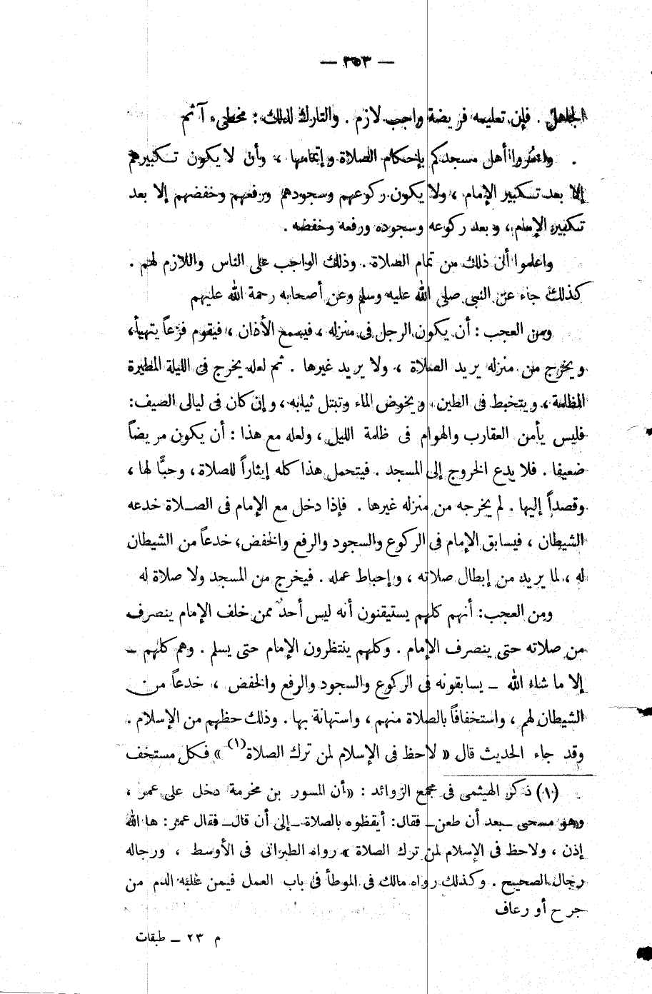 ومن العجب أنهم كلهم يستيقنون أنه ليس أحد ممن خلف الإمام ينصرف من صلاته حتى ينصرف الإمام وكلهم ينتظرون الإمام حتى يسلم وهم كلهم إلا ما شاء اللَّه يسابقونه فِي الركوع والسجود والرفع والخفض خدعا من الشيطان لهم واستخفافًا بالصلاة منهم واستهانة بها وذلك حظهم من الإسلام وقد جاء الحديث قَالَ: لا حظ فِي الإسلام لمن ترك الصلاة فكل مستخف