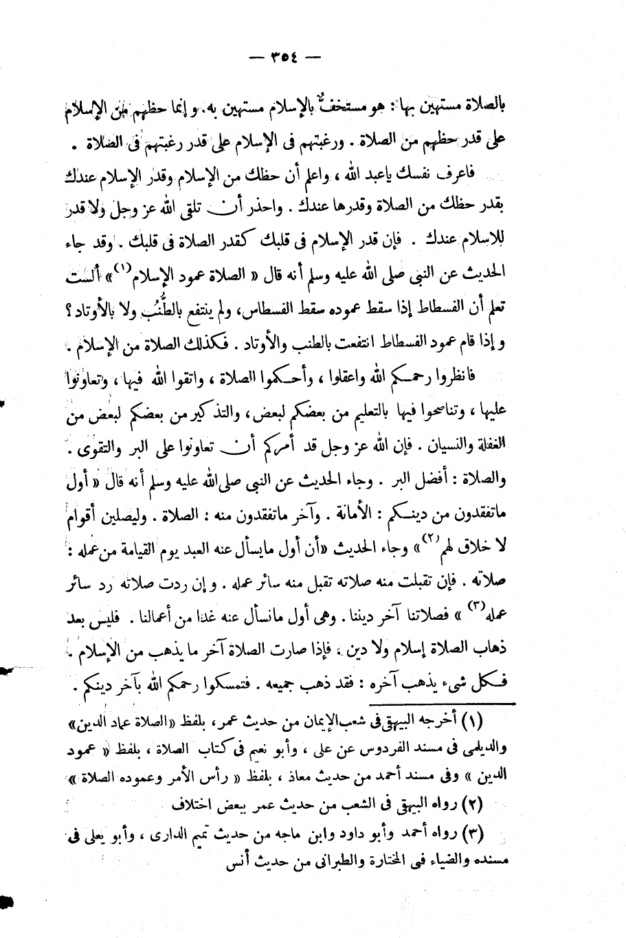 فاعرف نفسك يا عَبْد اللَّهِ واعلم أن حظك من الإسلام وقدر الإسلام عندك بقدر حظك من الصلاة وقدرها عندك واحذر أن تلقى اللَّه عَزَّ وَجَلَّ ولا قدر للإسلام عندك فإن قدر الإسلام فِي قلبك كقدر الصلاة فِي قلبك وقد جاء الحديث عَنِ النَّبِيِّ - صَلَّى اللَّهُ عَلَيْهِ وَسَلَّمَ - أنه قَالَ: " الصلاة عمود الإسلام " ألست تعلم أن الفسطاط إذا سقط عموده سقط الفسطاط ولم ينتفع بالطنب ولا بالأوتاد وإذا قام عمود الفسطاط انتفعت بالطنب والأوتاد فكذلك الصلاة من الإسلام.