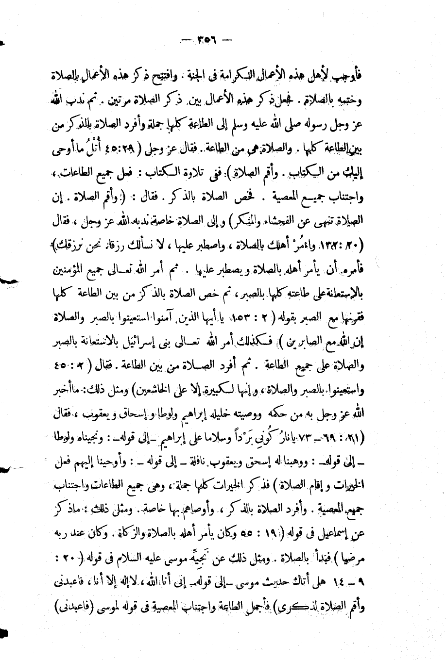ففي تلاوة الكتاب فعل جميع الطاعات واجتناب جميع المعصية فخص الصلاة بالذكر فقال: " وَأَقِمِ الصَّلاةَ إِنَّ الصَّلاةَ تَنْهَى عَنِ الْفَحْشَاءِ والمنكر " وإلى الصلاة خاصة ندبه اللَّه عَزَّ وَجَلَّ فقال: " وَأْمُرْ أَهْلَكَ بِالصَّلاةِ وَاصْطَبِرْ عَلَيْهَا، لا نَسْأَلُكَ رزقاً نحن نرزقك " فأمره أن يأمر أهله بالصلاة ويصطبر عليها ثم أمر اللَّه تعالى جميع المؤمنين بالاستعانة عَلَى طاعته كلها بالصبر ثم خص الصلاة بالذكر من بين الطاعة كلها فقرنها مع الصبر بقوله " يا أيها الَّذِينَ آمَنُوا اسْتَعِينُوا بِالصَّبْرِ وَالصَّلاةِ إن الله مع الصابرين " فكذلك أمر اللَّه تعالى بني إسرائيل بالاستعانة بالصبر والصلاة عَلَى جميع الطاعة ثم أفرد الصلاة من بين الطاعة فقال: " وَاسْتَعِينُوا بِالصَّبْرِ وَالصَّلاةِ وَإِنَّهَا لَكَبِيرَةٌ إِلا على الخاشعين " ومثل ذلك ما أخبر اللَّه عَزَّ وَجَلَّ به من حكمه ووصيته خليله إبراهيم ولوطا وإسحاق ويعقوب فقال: " يَا نَارُ كُونِي برداً وسلاماً على إبراهيم " إلى قوله " ونجيناه ولوطاً " إلى قوله " وَوَهَبْنَا لَهُ إِسْحَاقَ ويعقوب نافلة " إلى قوله " وَأَوْحَيْنَا إِلَيْهِمْ فِعْلَ الخيرات وإقام الصلاة " فذكر الخيرات كلها جملة وهي جميع الطاعات واجتناب جميع المعصية وأفرد الصلاة بالذكر وأوصاهم بها خاصة ومثل ذلك ما ذكر عَنْ إِسْمَاعِيل فِي قوله " وَكَانَ يَأْمُرُ أَهْلَهُ بِالصَّلاةِ وَالزَّكَاةِ وَكَانَ عند ربه مرضياً " فبدأ بالصلاة ومثل ذلك عَنْ نجيه مُوسَى عليه السلام فِي قوله " هَلْ أَتَاكَ حَدِيثُ مُوسَى إلى قوله إني أَنَا اللَّهُ لا إِلَهَ إِلا أَنَا فَاعْبُدْنِي وَأَقِمِ الصَّلاةَ لِذِكْرِي " فأجمل الطاعة واجتناب المعصية فِي قوله لموسى " فاعبدني " وأفرد الصلاة وأمر بها خاصة وقال الله عَزَّ وَجَلَّ " وَالَّذِينَ يُمَسِّكُونَ بِالْكِتَابِ وأقاموا الصلاة "