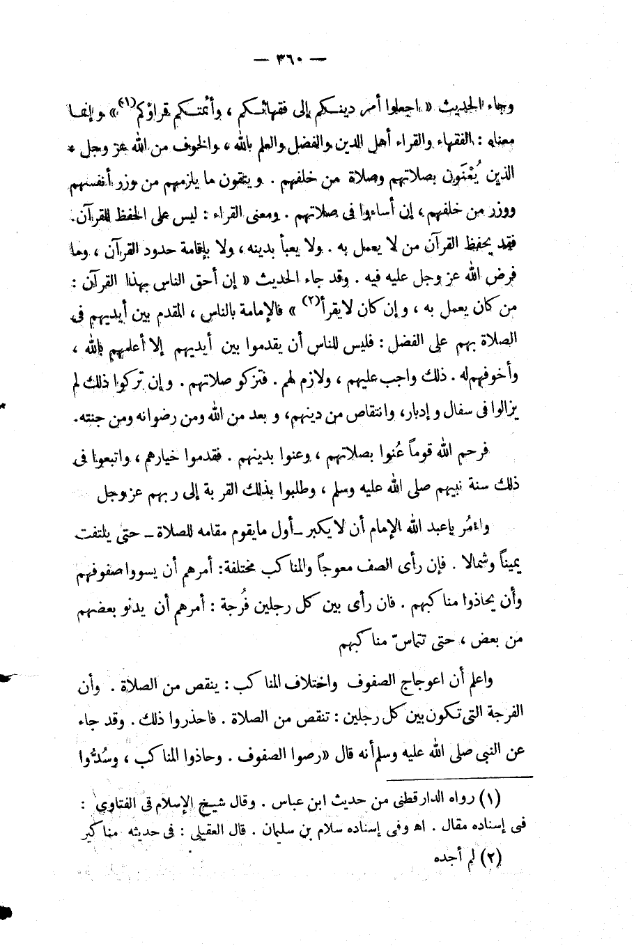 واعلم أن اعوجاج الصفوف واختلاف المناكب ينقص من الصلاة وأن الفرجة التي تكون بين كل رجلين تنقص من الصلاة فاحذروا ذلك وقد جاء عَنِ النَّبِيِّ - صَلَّى اللَّهُ عَلَيْهِ وَسَلَّمَ - أنه قَالَ: " رصوا الصفوف وحاذوا المناكب وسدوا
