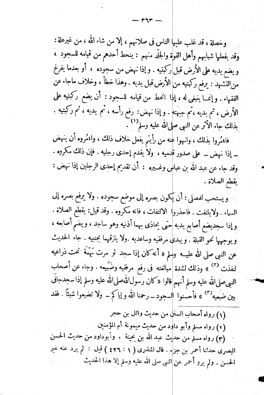وخصلة قد غلب عليها الناس فِي صلاتهم إلا من شاء اللَّه من غير علة وقد يفعلها شبابهم وأهل القوة والجلد منهم ينحط أحدهم من قيامه للسجود ويضع يديه عَلَى الأرض قبل ركبتيه وإذا نهض من سجوده أو بعدما يفرغ من التشهد يرفع ركبتيه من الأرض قبل يديه وهذا خطأ وخلاف ما جاء عن الفقهاء وإنما ينبغي له إذا انحط من قيامه للسجود أن يضع ركبتيه عَلَى الأرض ثم يديه ثم جبهته وإذا نهض رفع رأسه ثم يديه ثم ركبتيه بذلك جاء الأثر عَنِ النَّبِيّ - صَلَّى اللَّهُ عَلَيْهِ وَسَلَّمَ -.