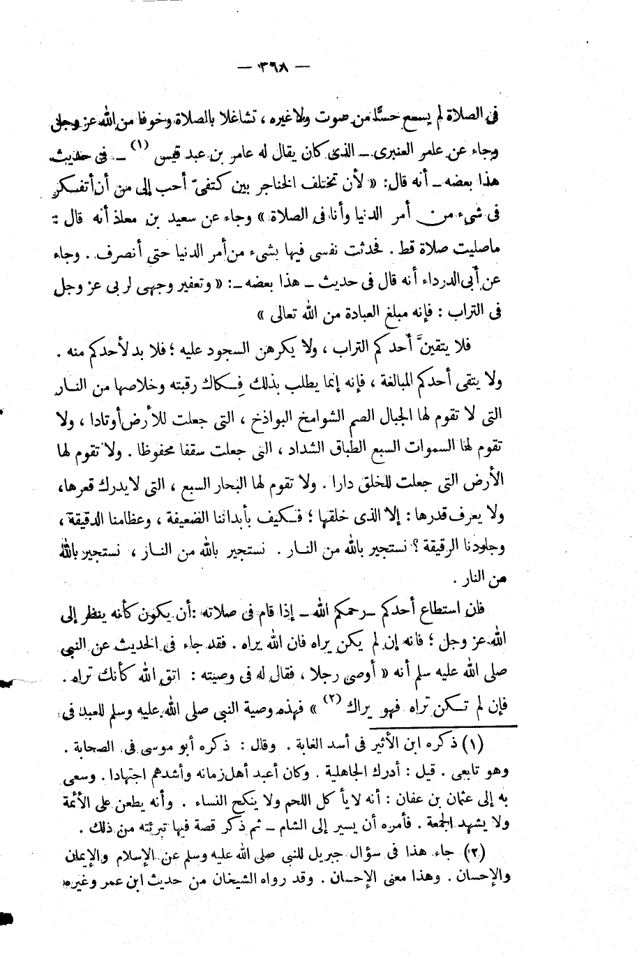 فِي الصلاة لم يسمع حسا من صوت ولا غيره تشاغلا بالصلاة وخوفا من اللَّه عَزَّ وَجَلَّ وجاء عَنْ عامر العنبري الذي كان يقال له عامر بْن عبد قيس فِي حديث هذا بعضه أنه قَالَ: " لأن تختلف الخناجر بين كتفي أحب إلى من أن أتفكر فِي شيء من أمر الدنيا وأنا فِي الصلاة " وجاء عَنْ سعيد بْن معاذ أنه قَالَ: ما صليت صلاة قط فحدثت نفسي فيها بشيء من أمر الدنيا حتى أنصرف وجاء عَنْ أبي الدرداء أنه قَالَ: فِي حديث هذا بعضه " وتعفير وجهي لربي عَزَّ وَجَلَّ فِي التراب فإنه مبلغ العبادة من اللَّه تعالى ".