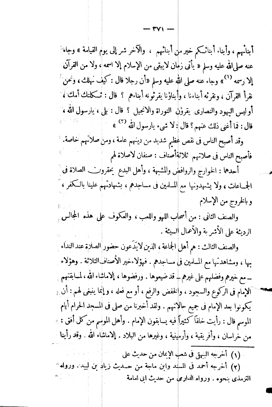 وقد أصبح الناس فِي نقص عظيم شديد من دينهم عامة ومن صلاتهم خاصة فأصبح الناس فِي صلاتهم ثلاثة أصناف صنفان لا صلاة لهم.
