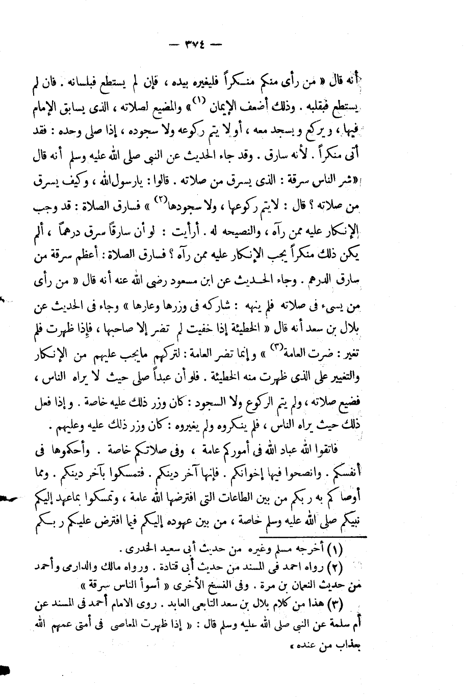 أنه قال: " ن رأي منكم منكرًا فليغيره بيده فإن لم يستطع فبلسانه فإن لم يستطع فبقلبه وذلك أضعف الإيمان " والمضيع لصلاته الذي يسابق الإمام فيها ويركع ويسجد معه أو لا يتم ركوعه ولا سجوده إذا صلّى وحده فقد أتى منكرًا لأنه سارق وقد جاء الحديث عَنِ النَّبِيّ - صَلَّى اللَّهُ عَلَيْهِ وَسَلَّمَ - أنه قَالَ: " شر الناس سرقة الذي يسرق من صلاته قالوا يا رَسُول اللَّهِ وكيف يسرق من صلاته قَالَ: لا يتم ركوعها ولا سجودها " فسارق الصلاة قد وجب الإنكار عليه ممن رآه والنصيحة له أرأيت لو أن سارقا سرق درهما ألم يكن ذلك منكرًا يجب الإنكار عليه ممن رآه فسارق الصلاة أعظم سرقة من سارق الدرهم وجاء الحديث عَنِ ابْن مَسْعُودٍ رَضِيَ اللَّهُ عنه أنه قَالَ: " من رأي من يسيء فِي صلاته فلم ينهه شاركه فِي وزرها وعارها " وجاء فِي الحديث عَنْ بلال بْن سعد أنه قَالَ: الخطيئة إذا خفيت لم تضر إلا صاحبها فإذا ظهرت فلم تغير ضرت العامة وإنما تضر العامة لتركهم ما يجب عليهم من الإنكار والتغيير عَلَى الذي ظهرت منه الخطيئة فلو أن عبدًا صلّى حيث لا يراه الناس فضيع صلاته ولم يتم الركوع ولا السجود كان وزر ذلك عليه خاصة وإذا فعل ذلك حيث يراه الناس فلم ينكروه ولم يغيره كان وزر ذلك عليه وعليهم.