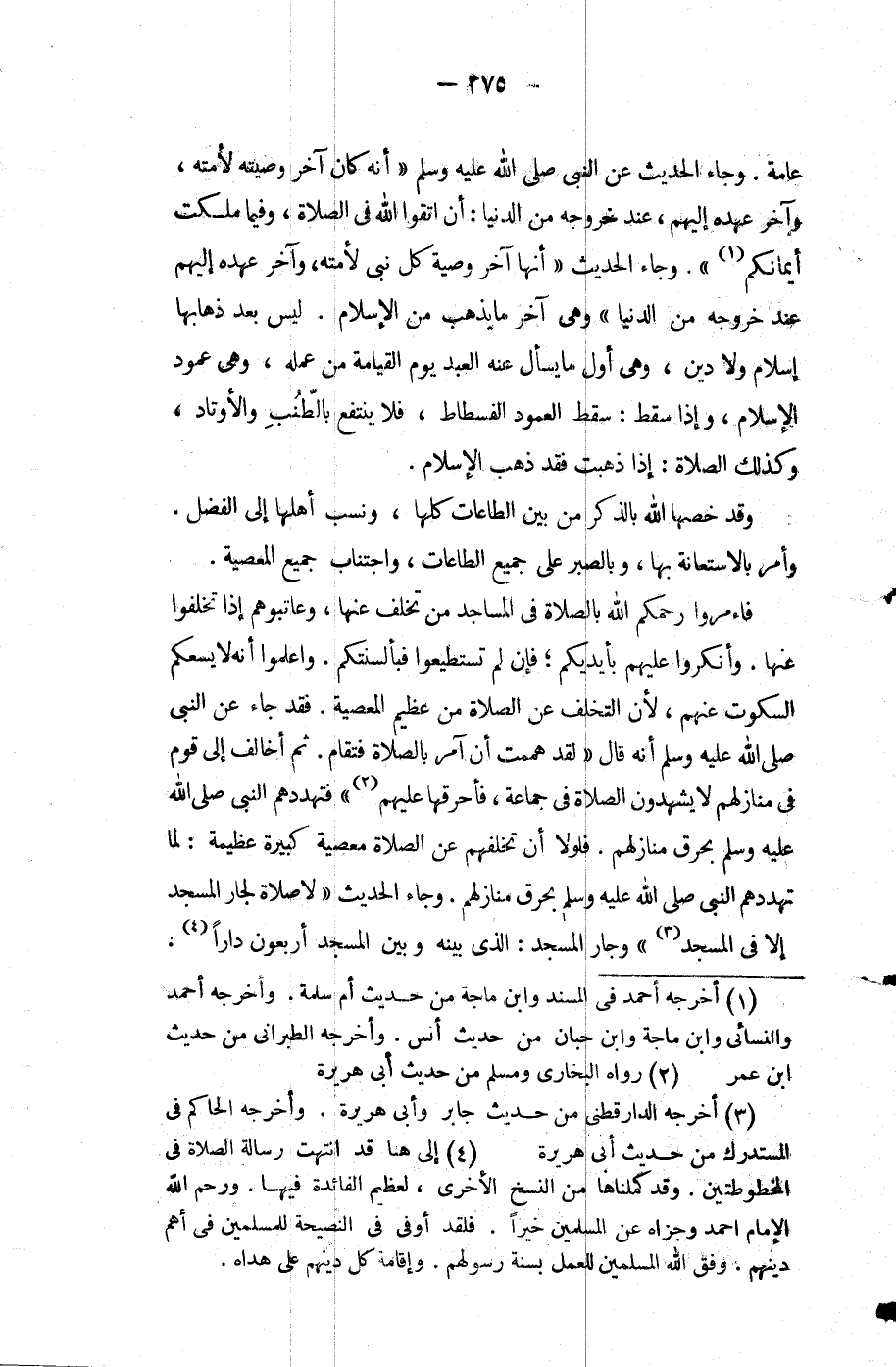 فأمروا رحمكم اللَّه بالصلاة فِي المساجد من تخلف عنها وعاتبوهم إذا تخلفوا عنها وأنكروا عليهم بأيديكم فإن لم تستطيعوا فبألسنتكم واعلموا أنه لا يسعكم السكوت عنهم لأن التخلف عَنِ الصلاة من عظيم المعصية فقد جاء عَنِ النَّبِيِّ - صَلَّى اللَّهُ عَلَيْهِ وَسَلَّمَ - أنه قَالَ: " لقد هممت أن آمر بالصلاة فتقام ثم أخالف إلى قوم فِي منازلهم لا يشهدون الصلاة فِي جماعة فأحرقها عليهم " فتهددهم النَّبِيّ - صَلَّى اللَّهُ عَلَيْهِ وَسَلَّمَ - بحرق منازلهم فلولا أن تخلفهم عَنِ الصلاة معصية كبيرة عظيمة لما تهددهم النَّبِيّ - صَلَّى اللَّهُ عَلَيْهِ وَسَلَّمَ - بحرق منازلهم وجاء الحديث لا صلاة لجار المسجد إلا فِي المسجد وجار المسجد الذي بينه وبين المسجد أربعون دارًا.