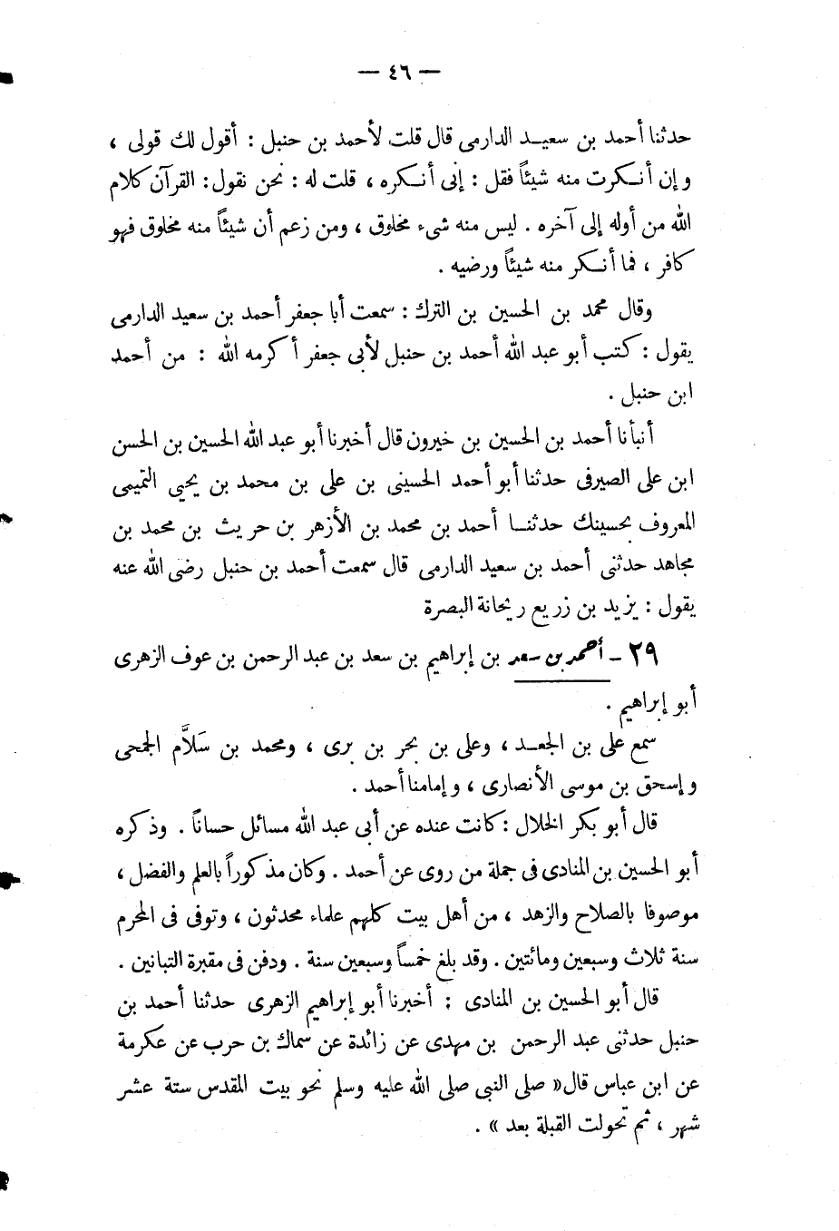 قَالَ أبو الحسين بن المنادي أَخْبَرَنَا أَبُو إِبْرَاهِيمَ الزُّهْرِيُّ حَدَّثَنَا أَحْمَدُ بْنُ حَنْبَلٍ حَدَّثَنِي عَبْدُ الرَّحْمَنِ بْنُ مَهْدِيٍّ عَنْ زَائِدَةَ عَنْ سِمَاكِ بْنِ حَرْبٍ عَنْ عِكْرِمَةَ عَنِ ابْنِ عَبَّاسٍ قَالَ صَلَّى النَّبِيُّ - صَلَّى اللَّهُ عَلَيْهِ وَسَلَّمَ - نَحْوَ بَيْتِ الْمَقْدِسِ ستة عشر شهر ثُمَّ تَحَوَّلَتِ الْقِبْلَةُ بَعْدُ.
