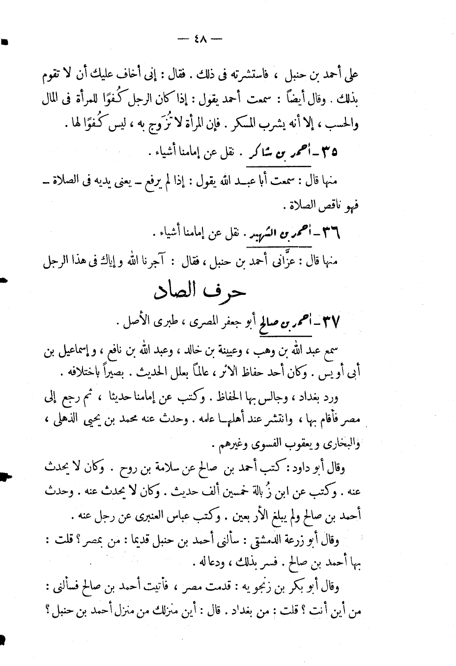 عَلَى أحمد بن حنبل فاستشرته فِي ذلك فقال إني أخاف عليك أن لا تقوم بذلك وقال أَيْضًا سمعت أحمد يقول إذا كان الرجل كفوًا للمرأة فِي المال والحسب إلا أنه يشرب المسكر فإن المرأة لا تزوج به ليس كفوًا لها.