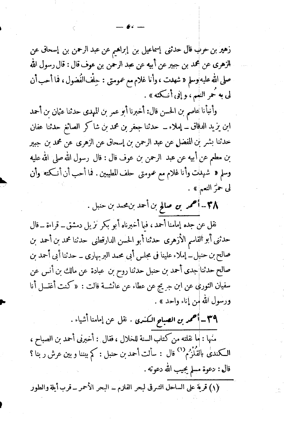 نقل عَنْ جده إمامنا أحمد فيما أَخْبَرَنَاهُ أَبُو بَكْرٍ نَزِيلُ دِمَشْقَ قِرَاءَةً قَالَ حَدَّثَنِي أَبُو الْقَاسِمِ الأَزْهَرِيُّ حَدَّثَنَا أْبُو الْحَسَنِ الدَّارَقُطْنِيُّ حَدَّثَنَا مُحَمَّدُ بْنُ أَحْمَدَ بْنِ صَالِحِ بْنِ حَنْبَلٍ إِمْلاءً عَلَيْنَا فِي مَجْلِسِ أَبِي مُحَمَّدٍ الْبَرْبَهَارِيِّ حَدَّثَنَا أَبِي أَحْمَدُ بْنُ صَالِحٍ حَدَّثَنَا جَدِّي أَحْمَدُ بْنُ حَنْبَلٍ حَدَّثَنَا رَوْحُ بْنُ عُبَادَةَ عَنْ مَالِكِ بْنِ أَنَسٍ عَنْ سُفْيَانَ الثَّوْرِيِّ عَنِ ابْنِ جُرَيْجٍ عَنْ عَطَاءٍ عَنْ عَائِشَةَ قَالَتْ كُنْتُ أَغْتَسِلُ أَنَا ورسول الله مِنْ إِنَاءٍ وَاحِدٍ.