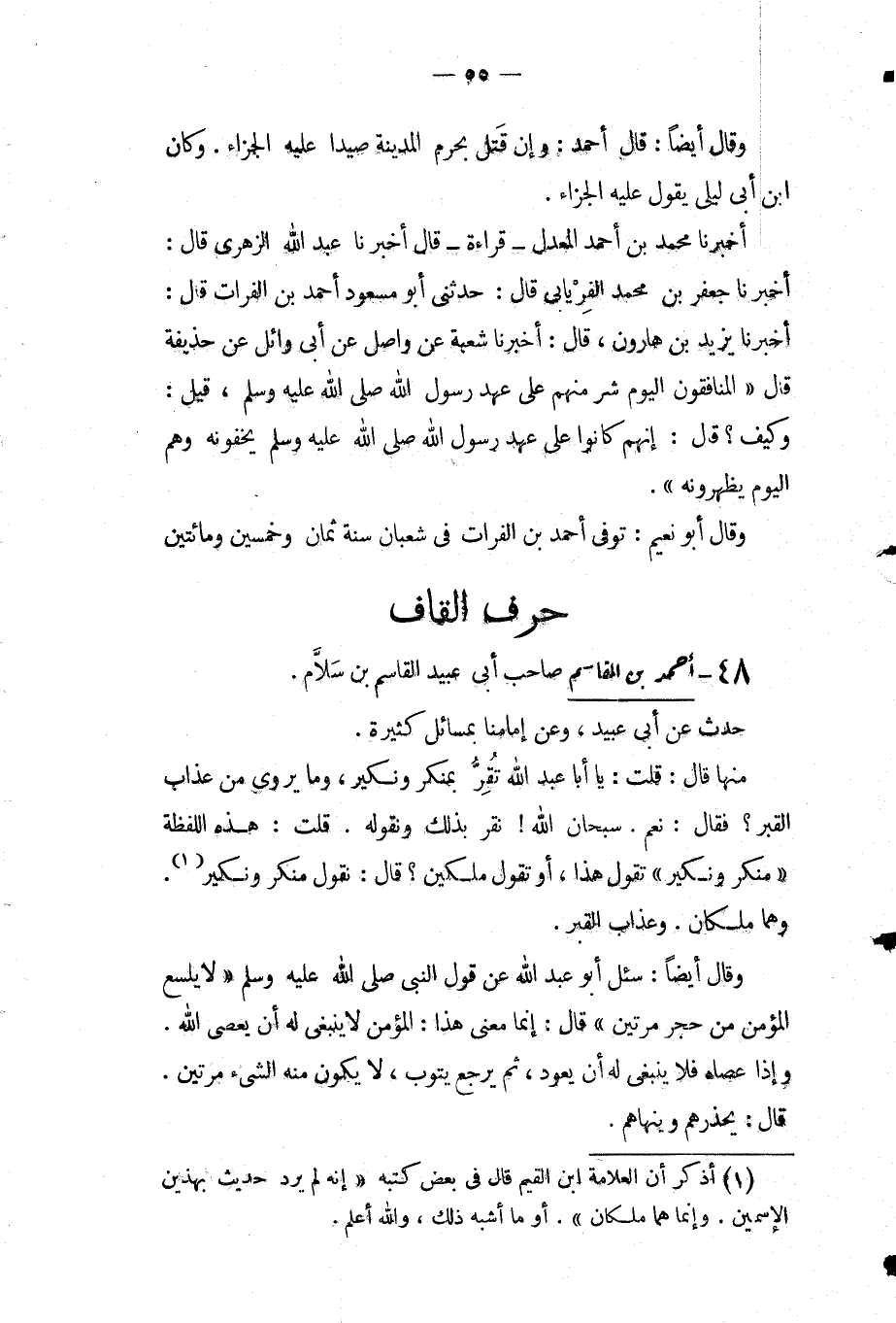 صاحب أبي عبيد القاسم بْن سلام: حدث عَنْ أبي عبيد وعن إمامنا بمسائل كثيرة: منها قَالَ: قلت: يا أبا عبد اللَّه تقر بمنكر ونكير وما يروى من عذاب القبر فقال: نعم سبحان اللَّه نقر بذلك ونقوله قلت: هذه اللفظة منكر ونكير تقول هذا أو تقول ملكين قَالَ: نقول منكر ونكير وهما ملكان وعذاب القبر.