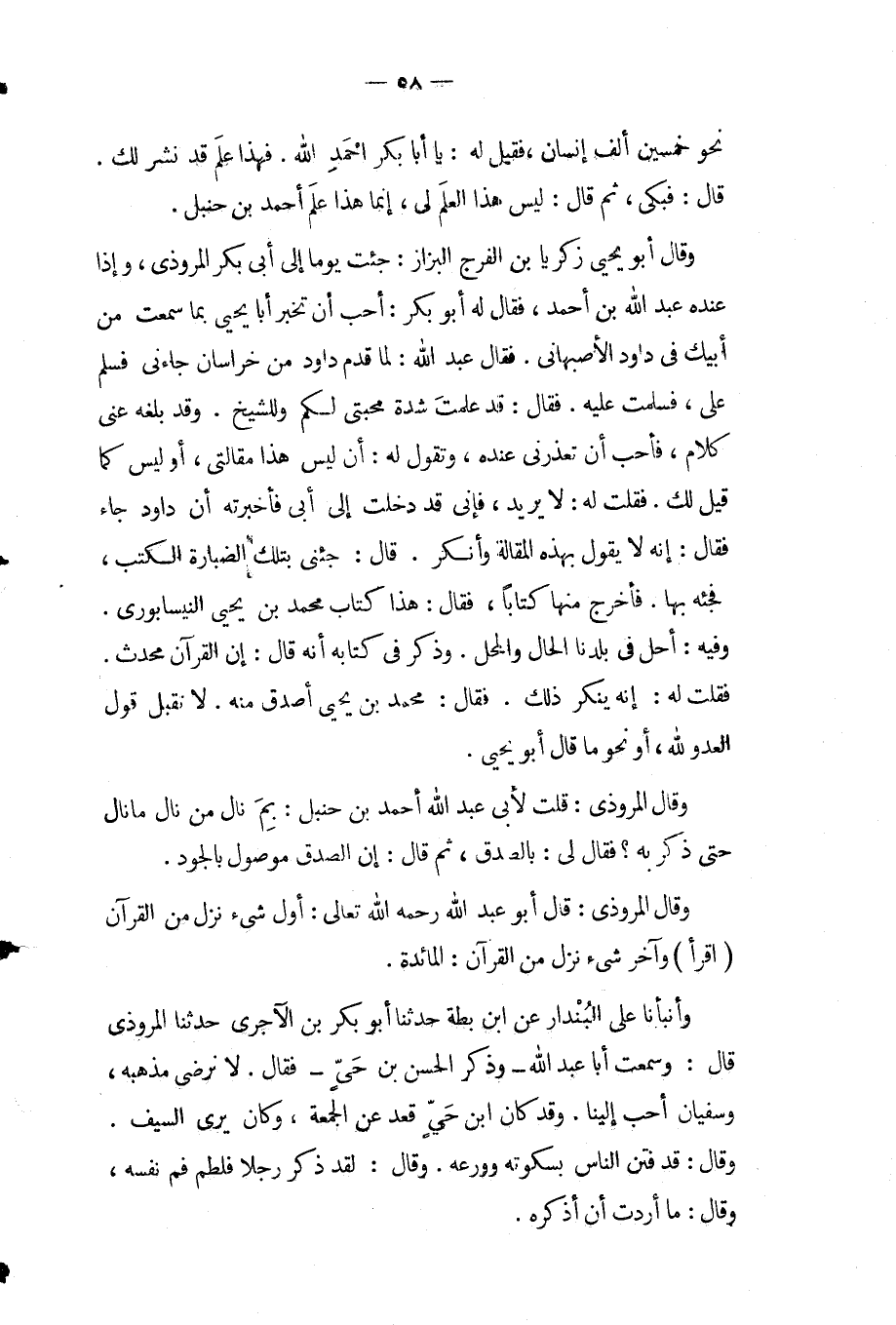 وقال أبو يَحْيَى زكريا بْن الفرج البزاز جئت يوما إلى أبي بكر المروذي وإذا عنده عبد اللَّه بْن أحمد له أبو بكر أحب أن تخبر أبا يَحْيَى بما سمعت من أبيك فِي داود الأصبهاني فقال: فقال عبد اللَّه لما قدم داود من خراسان جاءني فسلم عَلِيّ فسلمت عليه فقال: قد علمت شدة محبتي لكم وللشيخ وقد بلغه عني كلام فأحب أن تعذرني عنده وتقول له أن ليس هذا مقالتي أو ليس كما قيل لك فقلت: له لا يريد فإني قد دخلت إلى أبي فأخبرته أن داود جاء فقال: إنه لا يقول بهذه المقالة وأنكر قَالَ: جئني بتلك الضبارة الكتب فجئه بها فأخرج منها كتابا فقال: هذا كتاب مُحَمَّد بْن يَحْيَى النيسابوري وفيه أحل فِي بلدنا الحال والمحل وذكر فِي كتابه أنه قَالَ: إن القرآن محدث فقلت: له إنه ينكر ذلك فقال: مُحَمَّد بْن يَحْيَى أصدق منه لا تقبل قول العدو لله أو نحو ما قَالَ: أبو يَحْيَى.
