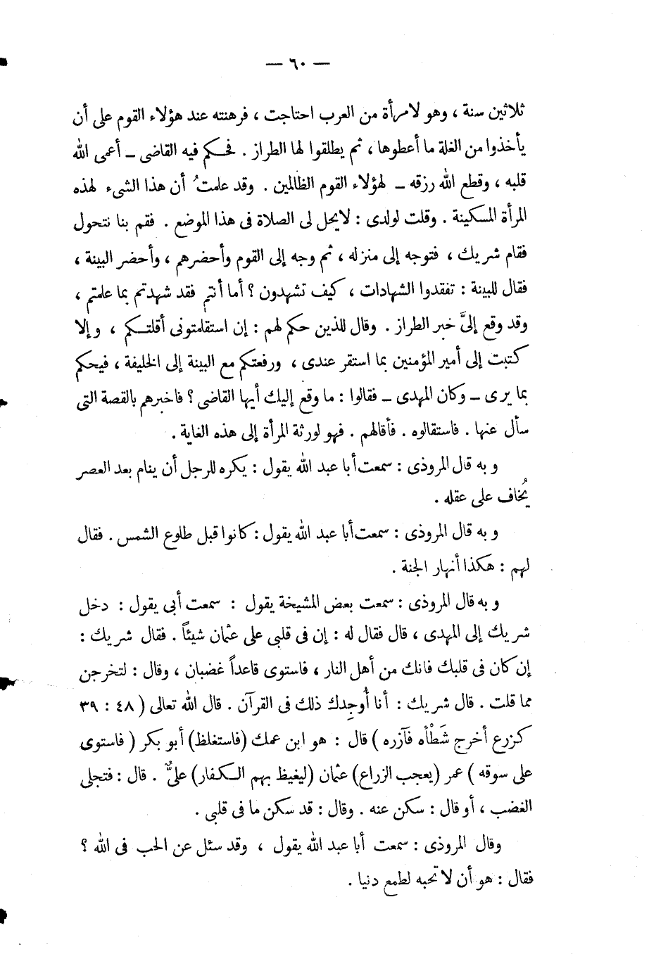 وبه قال: المروذي سمعت بعض المشيخة يقول سمعت أبي يقول دخل شريك إلى المهدي قَالَ: فقال: له إن فِي قلبي عَلَى عثمان شيئًا فقال: شريك إن كان فِي قلبك فإنك من أهل النار فاستوى قاعدًا غضبان وقال لتخرجن مما قلت: قَالَ: شريك أنا أوجدك ذلك فِي القرآن قَالَ: اللَّهُ تعالى " كَزَرْعٍ أَخْرَجَ شَطْأَهُ فآزره " قَالَ: هو ابن عمك " فَاسْتَغْلَظَ " أبو بكر " فَاسْتَوَى عَلَى سُوقِهِ " عمر " يعجب الزراع " عثمان " ليغيظ بهم الكفار " عَلِيّ قَالَ: فتجلى الغضب أو قَالَ: سكن عنه وقال قد سكن ما فِي قلبي.