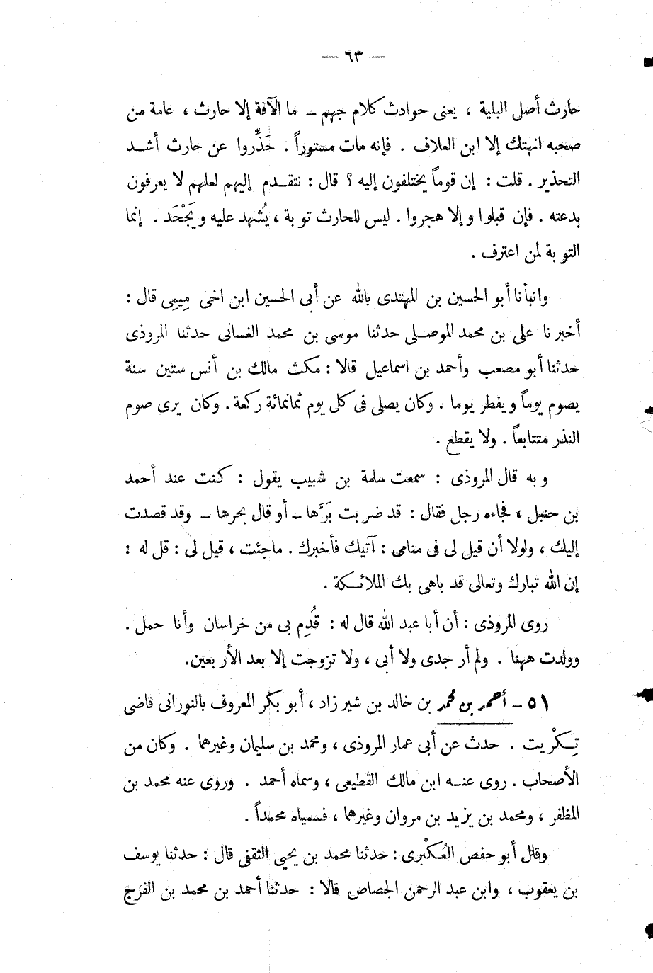 حارث أصل البلية يعني حوادث كلام جهم ما الآقة إلا حارث عامة من صحبه انبتك إلا ابن العلاف فإنه مات مستورا حذروا عَنْ حارث أشد التحذير قلت: إن قوما يختلفون إليه قَالَ: نتقدم إليهم لعلهم لا يعرفون بدعته فإن قبلوا وإلا هجروا ليس للحارث توبة يشهد عليه ويجحد إنما التوبة لمن اعترف.