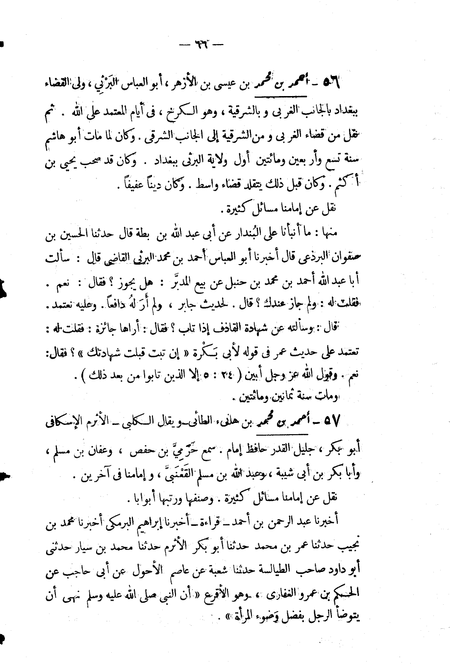 منها ما أَنْبَأَنَا عَلَى البندار عَنْ أبي عبد اللَّه بْن بطة قَالَ: حَدَّثَنَا الحسين بْن صفوان البرذعي قَالَ: أَخْبَرَنَا أبو العباس أحمد بن محمد البرثي القاضي قَالَ: سألت أبا عبد اللَّه أحمد بن محمد بْنِ حنبل عَنْ بيع المدبر هل يجوز فقال: نعم فقلت: له ولم جاز عندك قَالَ: لحديث جابر ولم أر له دافعا وعليه نعتمد.