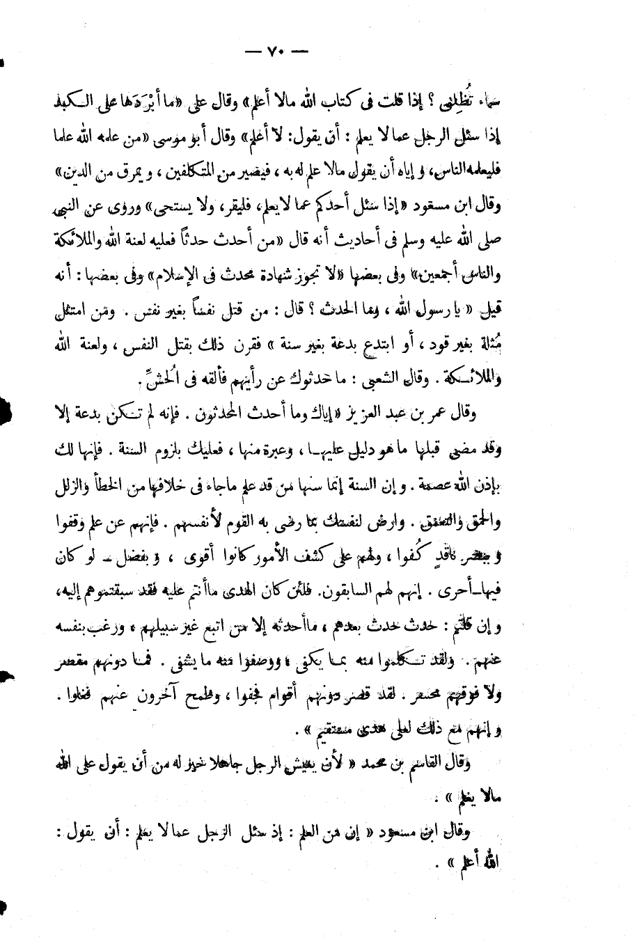 سماء تظلني إذا قلت: فِي كتاب اللَّه ما لا أعلم وقال عَلِيّ ما أبردها عَلَى الكبد إذا سئل الرجل عما لا يعلم أن يقول لا أعلم وقال أبو مُوسَى من علمه اللَّه علما فليعلمه الناس وإياه أن يقول مالا علم له به فيصير من المتكلفين ويمرق من الدين وقال ابن سعود إذا سئل أحدكم عما لا يعلم فليقر ولا يستحي وروى عن االنبي - صَلَّى اللَّهُ عَلَيْهِ وَسَلَّمَ - فِي أحاديث أنه قَالَ: " من أحدث حدثا فعليه لعنة اللَّه والملائكة والناس أجمعين " وفي بعضها لا تجوز شهادة محدث فِي الإسلام وفي بعضها أنه قيل يا رَسُول اللَّهِ وما الحدث قَالَ: من قتل نفسًا بغير نفس ومن امتثل مثلة بغير قود أو ابتدع بدعة بغير سنة فقرن ذلك بقتل النفس ولعنة اللَّه والملائكة وقال الشعبي ما حدثوك عَنْ رأيهم فألقه فِي الحش.