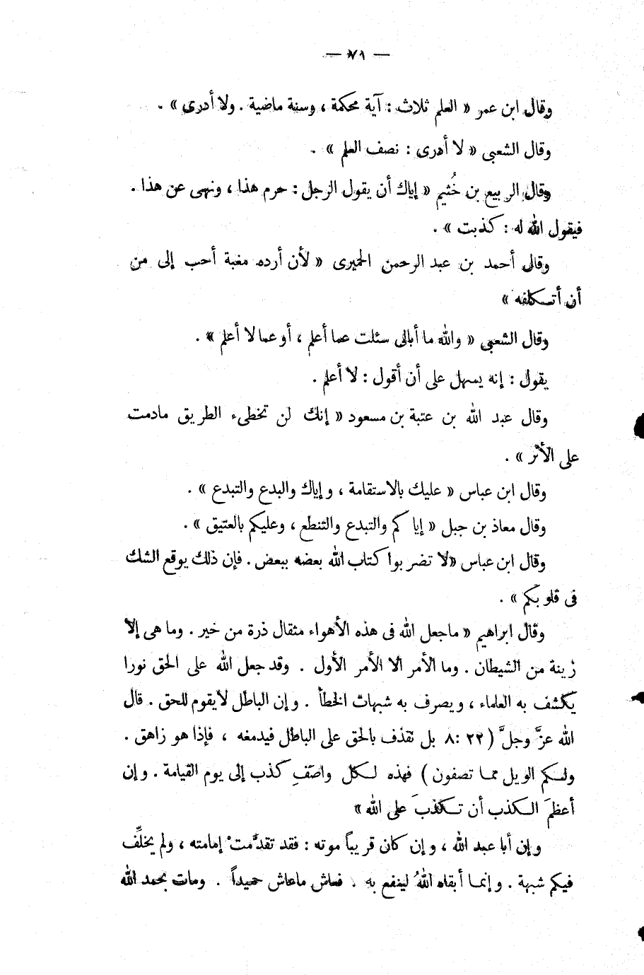 وقال إِبْرَاهِيم ما جعل اللَّه فِي هذه الأهواء مثقال ذرة من خير وما هي إلا زينة من الشيطان وما الأمر إلا الأمر الأول وقد جعل اللَّه عَلَى الحق نورًا يكشف به العلماء ويصرف به شبهات الخطأ وإن الباطل لا يقوم للحق قَالَ: اللَّهُ عَزَّ وَجَلَّ " بَلْ نَقْذِفُ بِالْحَقِّ عَلَى الْبَاطِلِ فَيَدْمَغُهُ فَإِذَا هُوَ زَاهِقٌ وَلَكُمُ الويل مما تصفون " فهذه لكل واصف كذب إلى يوم القيامة وإن أعظم الكذب أن تكذب عَلَى اللَّه.