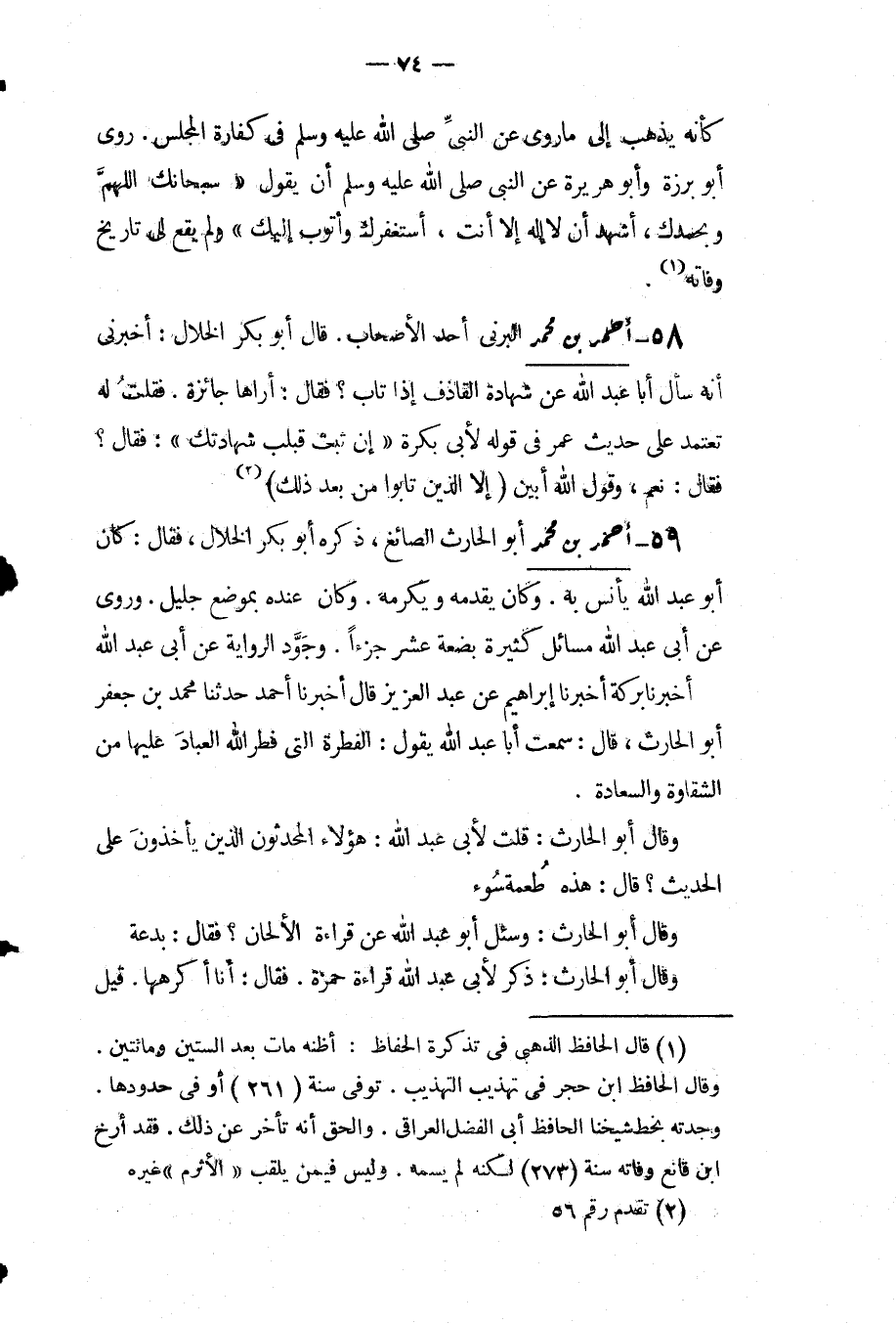 أحد الأصحاب قَالَ: أبو بكر الخلال أَخْبَرَنِي أنه سأل أبا عبد اللَّه عَنْ شهادة القاذف إذا تاب فقال: أراها جائزة فقلت: له تعتمد عَلَى حديث عمر فِي قوله لأبي بكرة إن تبت قبلت شهادتك فقال: نعم وقول اللَّه أبين " إِلا الَّذِينَ تَابُوا مِنْ بَعْدِ ذَلِكَ ".