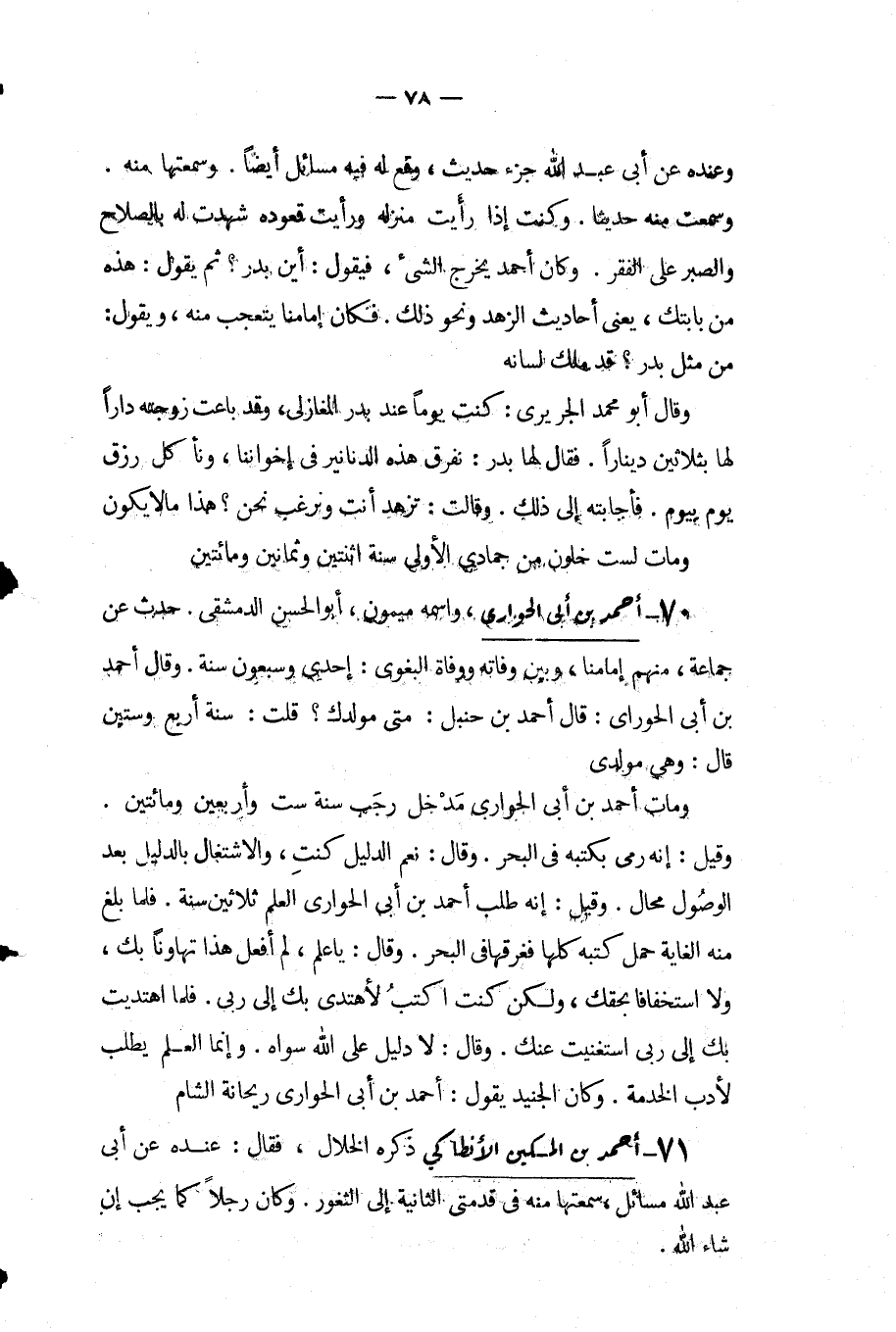 حدث عَنْ جماعة منهم إمامنا وبين وفاته ووفاة البغوي إحدى وسبعون سنة وقال أَحْمَد بْن أبي الحواري قَالَ أَحْمَد بن حنبل متى مولدك قلت: سنة أربع وستين قَالَ: وهي مولدي.