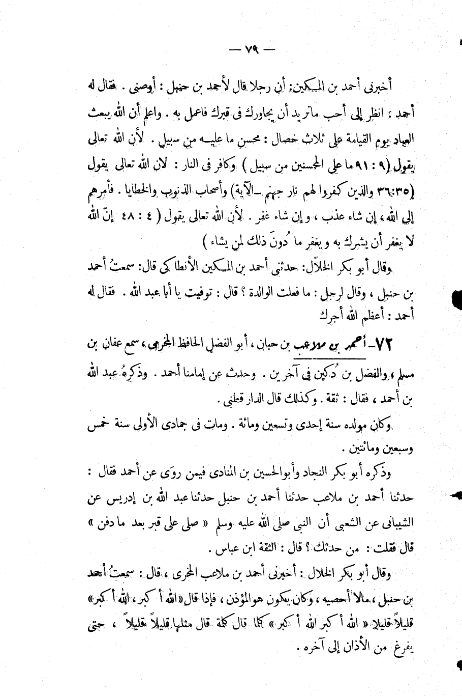 وذكره أبو بكر النجاد وأبو الحسين بْن المنادي فيمن روى عَنْ أَحْمَد فقال: حَدَّثَنَا أَحْمَدُ بْنُ مُلاعِبَ حَدَّثَنَا أَحْمَدُ بْنُ حَنْبَلٍ حَدَّثَنَا عَبْدُ اللَّهِ بْنُ إِدْرِيسَ عَنِ الشَّيْبَانِيِّ عَنِ الشَّعْبِيِّ أَنّ النَّبِيَّ - صَلَّى الله عليه وسلم - صلى قَبْرٍ بَعْدَ مَا دُفِنَ قَالَ: فَقُلْتُ: مَنْ حَدَّثَكَ قَالَ: الثِّقَةُ ابْنُ عَبَّاسٍ.