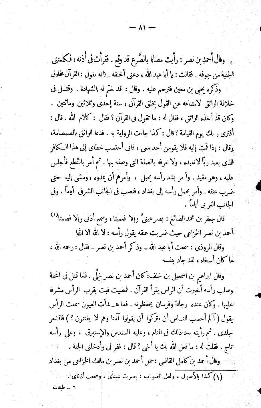 وقال إِبْرَاهِيم بْن إِسْمَاعِيلَ بْنِ خلف كان أَحْمَد بْن نصر خلي فلما قتل فِي المحنة وصلب رأسه أخبرت أن الرأس يقرأ القرآن فمضيت فبت بقرب الرأس مشرفا عليها وكان عنده رجالة وفرسان يحفظونه فلما هدأت العيون سمعت الرأس يقول " الم أَحَسِبَ النَّاسُ أَنْ يُتْرَكُوا أَنْ يَقُولُوا آمَنَّا وَهُمْ لا يفتنون " فاقشعر جلدي ثم رأيته بعد ذلك فِي المنام وعليه السندس والاستبرق وعلى رأسه تاج فقلت: له ما فعل اللَّه بك يا أخي قَالَ: غفر لي وأدخلني الجنة.