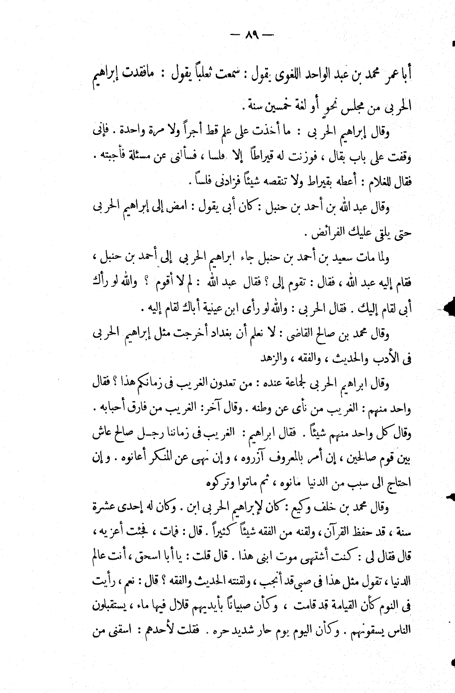 أبا عمر مُحَمَّد بْن عبد الواحد اللغوي يقول سمعت ثعلبا يقول ما فقدت إِبْرَاهِيم الحربي من مجلس نحو أو لغة خمسين سنة.