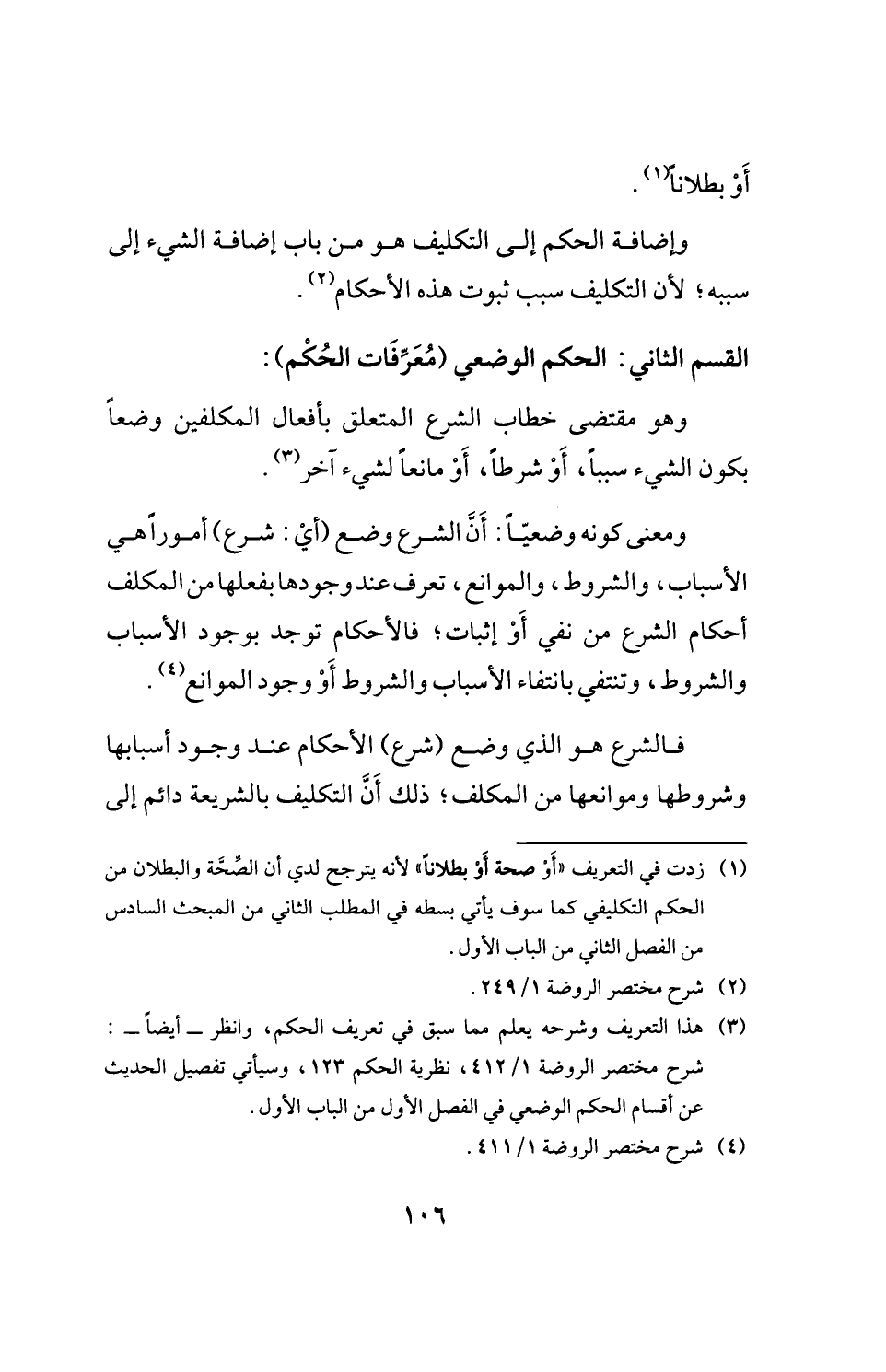 (¬1) زدت في التعريف "أَوْ صحة أَوْ بطلانًا" لأنه يترجح لدي أن الصِّحَة والبطلان من الحكم التكليفي كما سوف يأتي بسطه في المطلب الثاني من المبحث السادس من الفصل الثاني من الباب الأول.