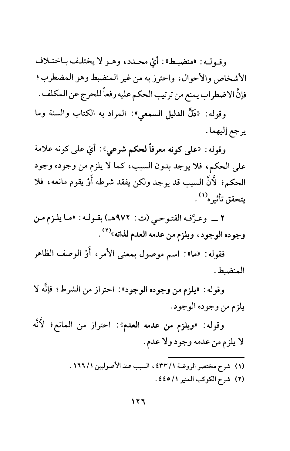 2 - وعرَّفه الفتوحي (ت: 972 هـ) بقوله: "ما يلزم من وجوده الوجود، ويلزم من عدمه العدم لذاته" (¬2).