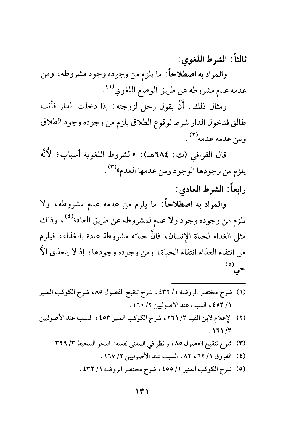 قال القرافي (ت: 684 هـ): "الشروط اللغوية أسباب؛ لأَنَّه يلزم من وجودها الوجود ومن عدمها العدم" (¬3).