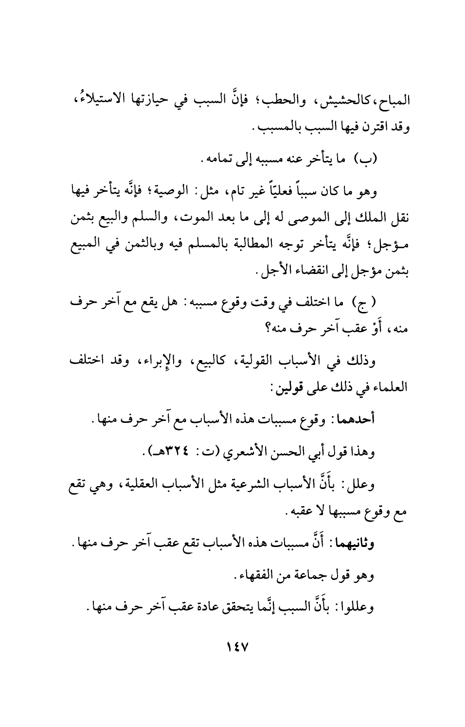 وعلل: بأَنَّ الأسباب الشرعية مثل الأسباب العقلية، وهي تقع مع وقوع مسببها لا عقبه.