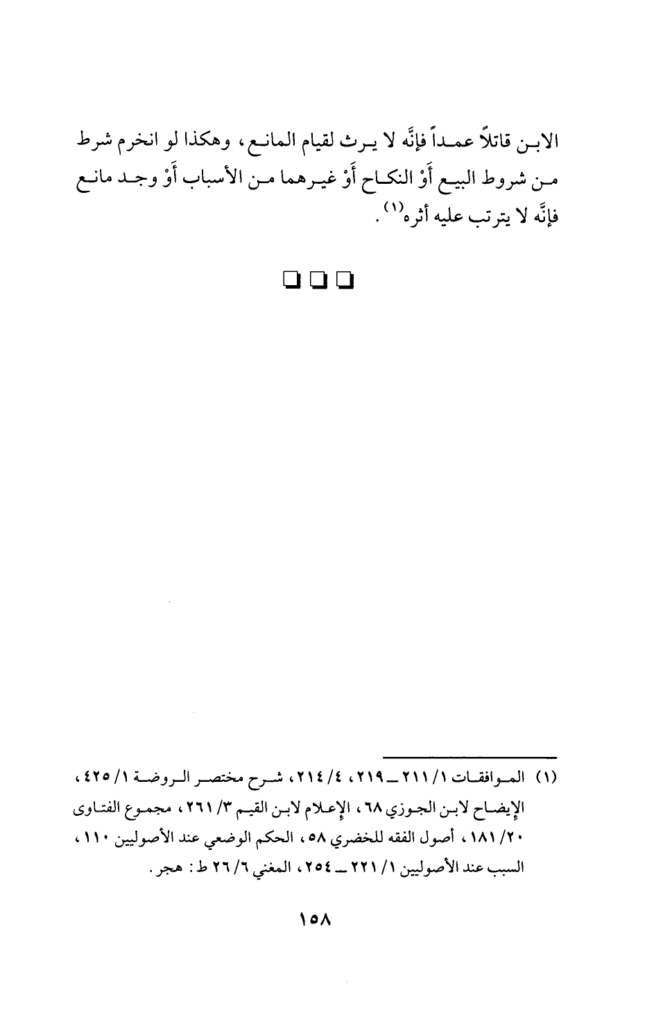 الابن قاتلًا عمدًا فإنَّه لا يرث لقيام المانع، وهكذا لو انخرم شرط من شروط البيع أَوْ النكاح أَوْ غيرهما من الأسباب أَوْ وجد مانع فإنَّه لا يترتب عليه أثره (¬1).